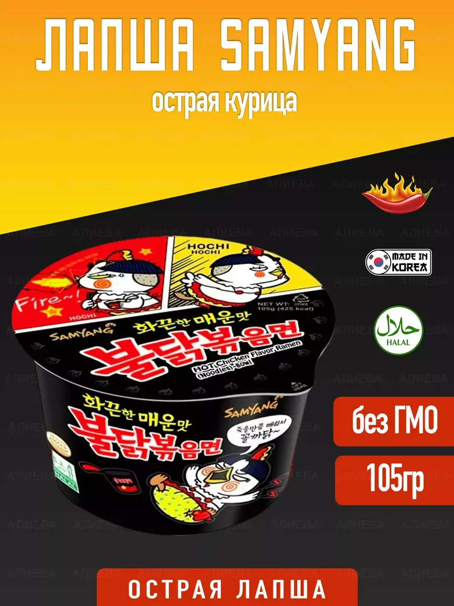Острая лапша быстрого приготовления от известного корейского производителя выпущена в удобной упаковке- чаше. Острая лапша со вкусом курицы в удобной чаше полностью передает колорит корейской острой кухни. Вкус запомнится надолго!Способ приготовления:1. Открыть крышку наполовину, достать пакетики с приправами.2. Лапшу залить кипятком до линии, указанной внутри чашки, закрыть крышкой на 4-5 минут.3. Слить воду через отверстия на крышке, добавить соус и сухую приправу, хорошо перемешать.Информация , так же , укажана на упаковке .
