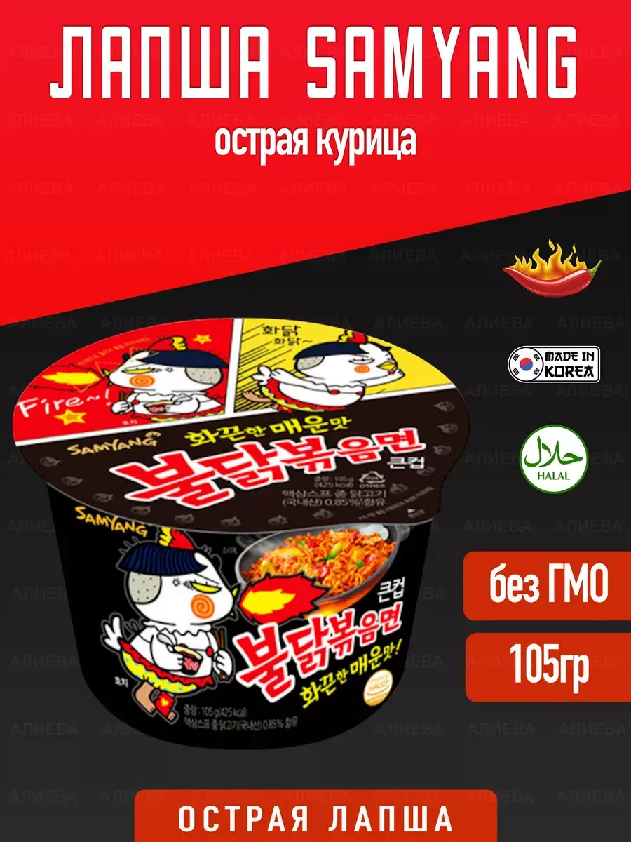 Острая лапша быстрого приготовления от известного корейского производителя выпущена в удобной упаковке- чаше. Острая лапша со вкусом курицы в удобной чаше полностью передает колорит корейской острой кухни. Вкус запомнится надолго!Способ приготовления:1. Открыть крышку наполовину, достать пакетики с приправами.2. Лапшу залить кипятком до линии, указанной внутри чашки, закрыть крышкой на 4-5 минут.3. Слить воду через отверстия на крышке, добавить соус и сухую приправу, хорошо перемешать.Информация , так же , укажана на упаковке .