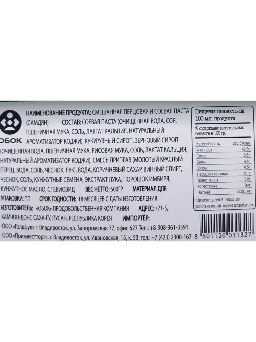 Соевая и смешанная перцовая паста Самдян Синг Сонг- мастхэв для блюд азиатской кухни. Это готовый соус, который также можно использовать в качестве маринада для мяса и рыбы. Умеренная острота, яркий вкус и насыщенный аромат -прекрасное сочетание!Соевая паста (очищенная вода, соя, пшеничная мука, соль, лактат кальция, натуральный ароматизатор коджи), кукурузный сироп, зерновой сироп (очищенная вода, пшеничная мука, рисовая мука, соль, лактат кальция, натуральный ароматизатор коджи), смесь приправ (молотый красный перец, вода, соль, чеснок, лук), вода, коричневый сахар, винный спирт, чеснок, соль, кунжутные семена, экстракт лука, порошок имбиря, кунжутное масло, стевиозид.