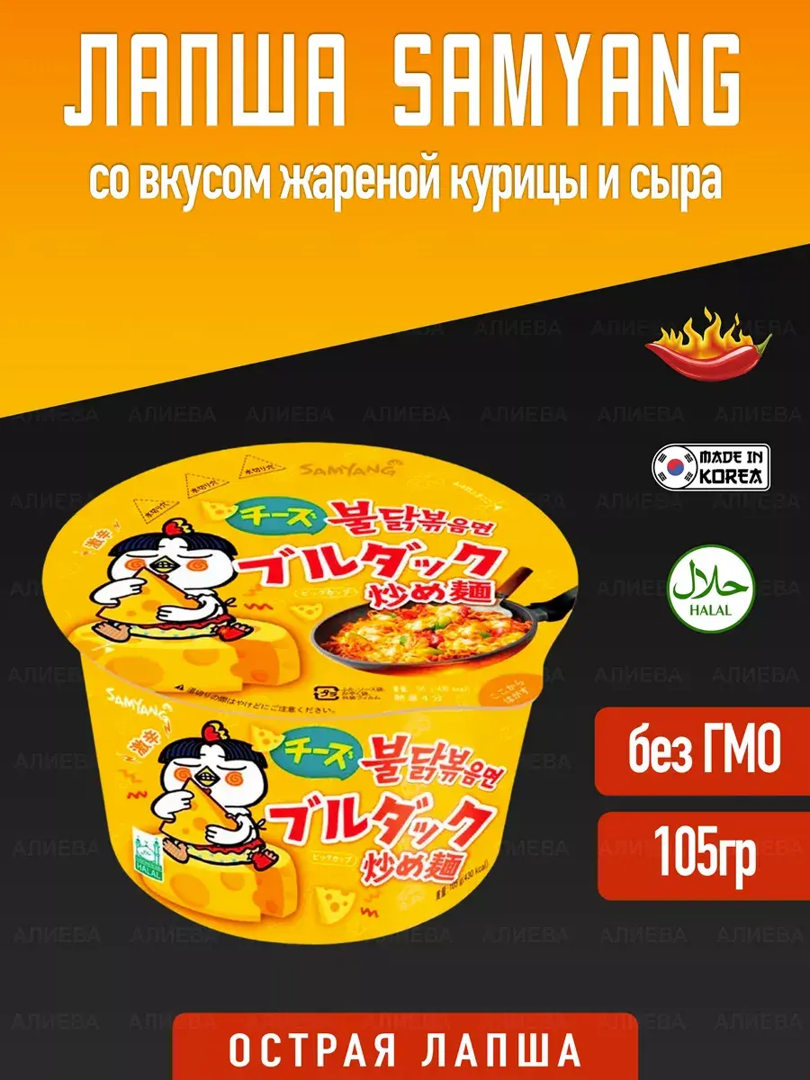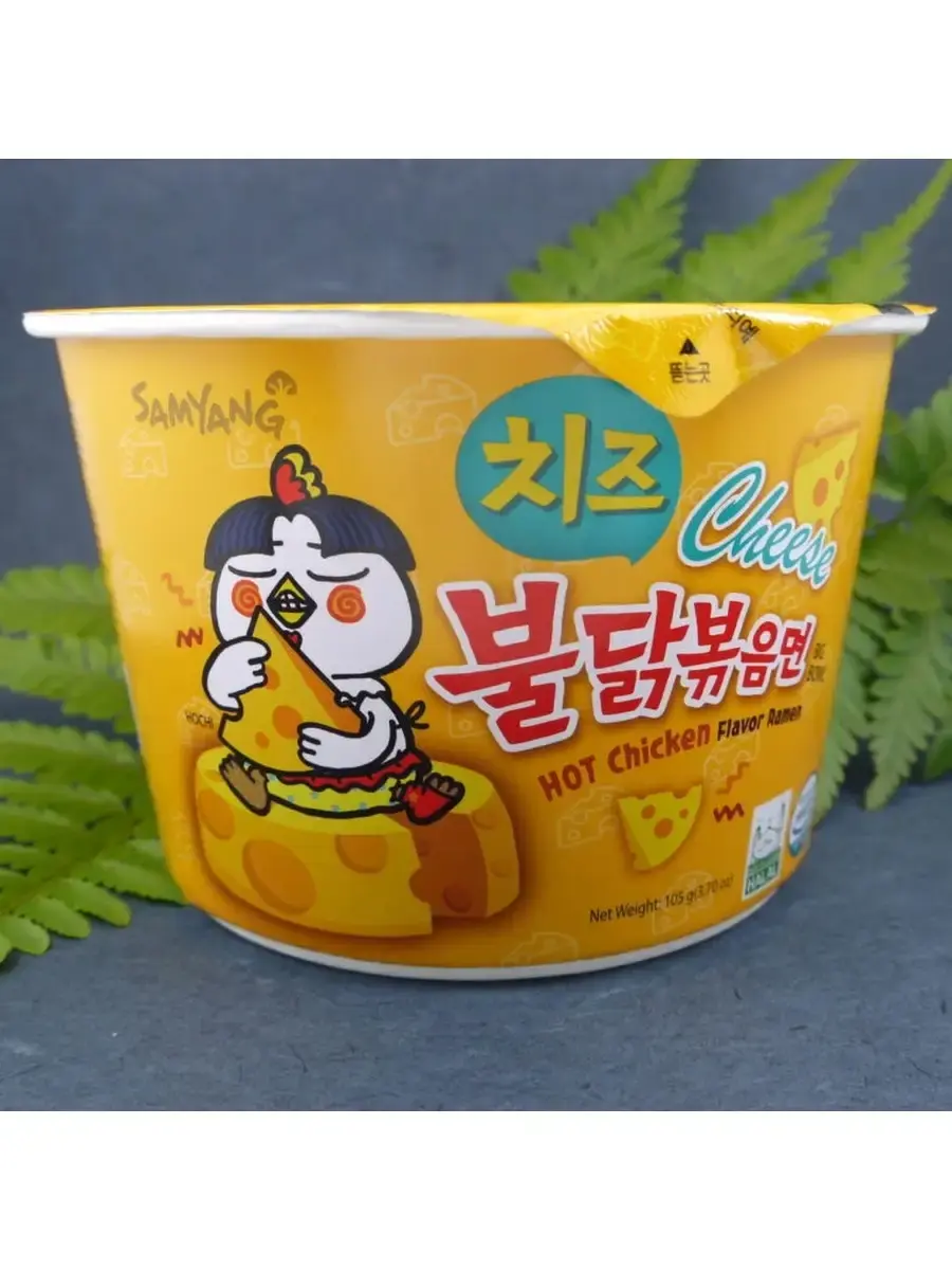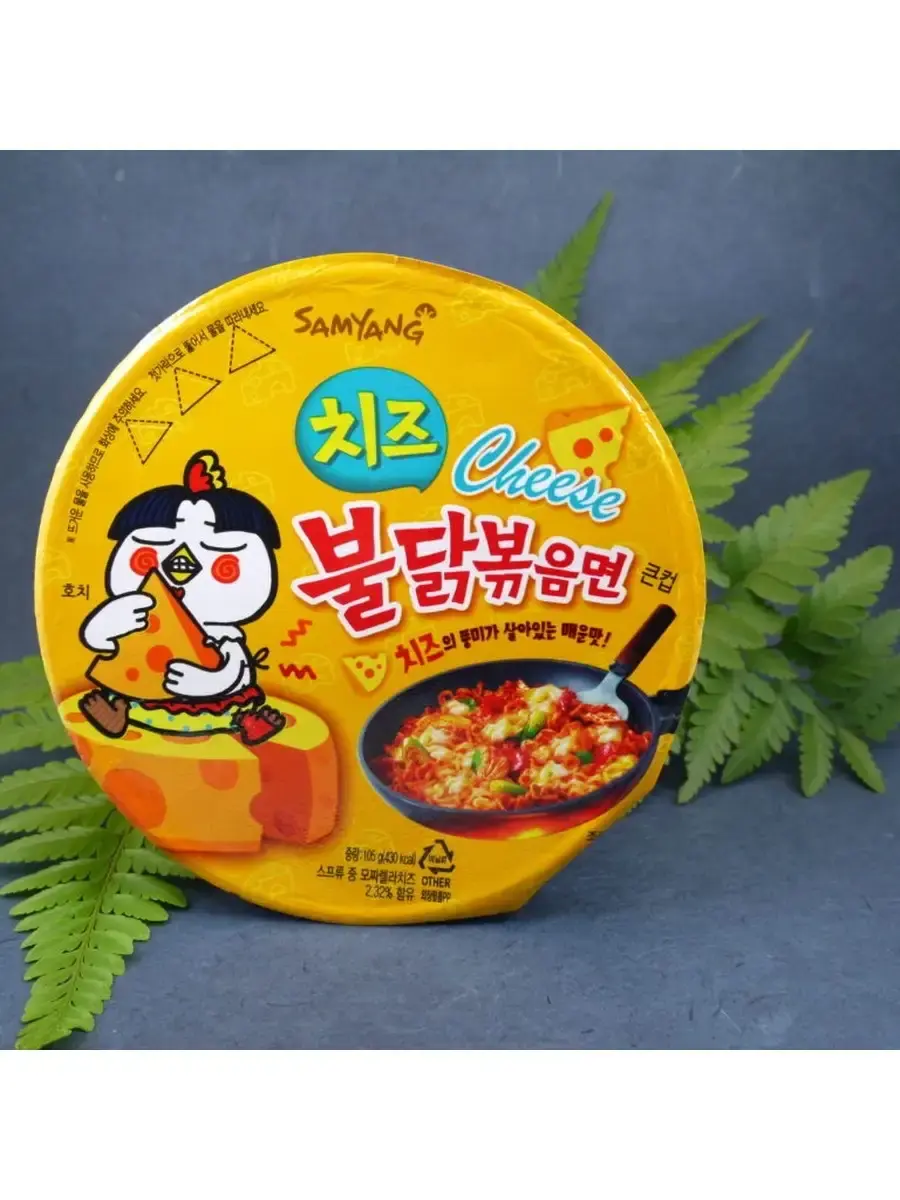 "Hot Chicken Flavor Ramen Cheese" - сублимированная лапша быстрого приготовления со вкусом жареной курицы и сыра. Качественный и высокоэнергетический продукт с острым вкусом. Пользуется популярностью среди любителей корейских блюд. Способ приготовления Открыть крышку наполовину, достать пакетики с приправами. Лапшу залить кипятком до линии, указанной внутри чашки, закрыть крышкой на 4-5 минут. Слить воду через отверстия на крышке, добавить соус и сухую приправу, хорошо перемешать.