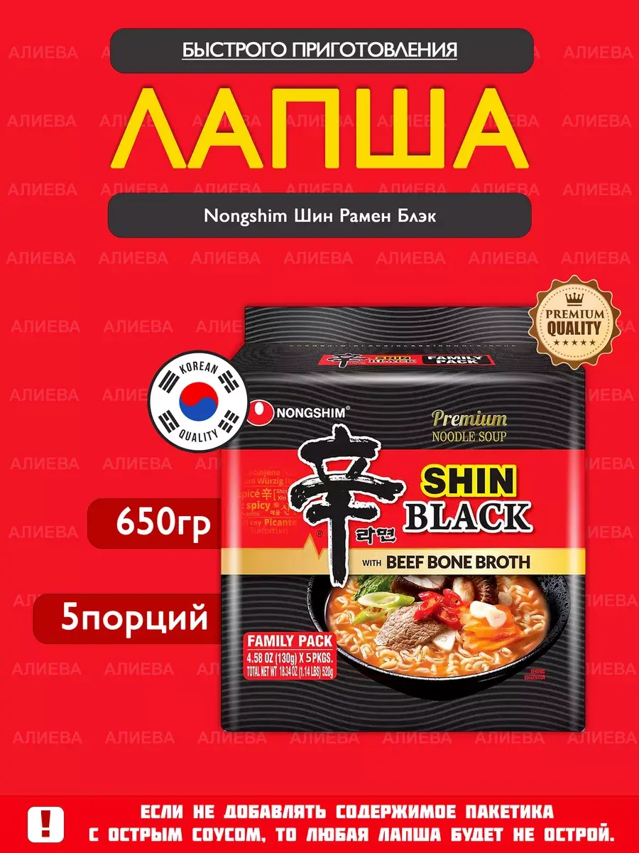 Shin Ramyun Black – флагманский продукт корейского концерна Nongshim. Невероятный вкус этой тонкой, гладкой и эластичной пшеничной лапши Рамен с изумительной текстурой обеспечивается «двойным» насыщенным бульоном из говядины и свинины. Дополнительные яркие ноты умами добавляет экстракт анчоусов, креветок и водорослей, а овощные и рыбные хлопья отлично насыщают.