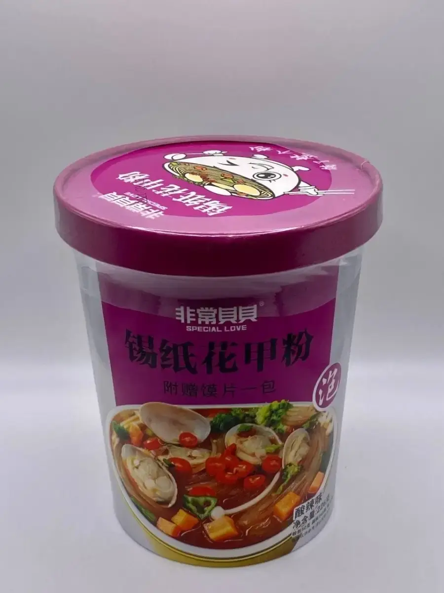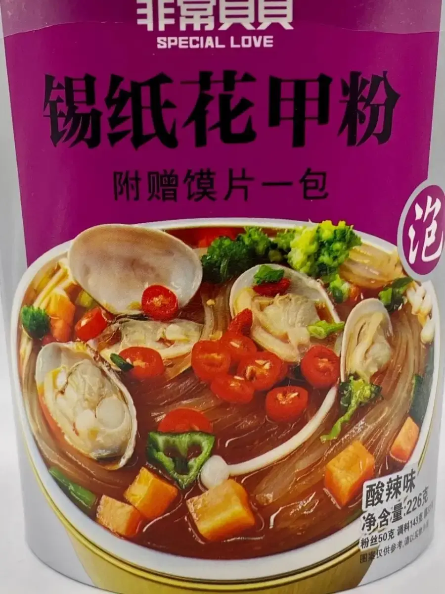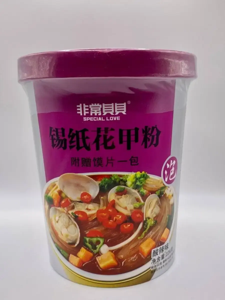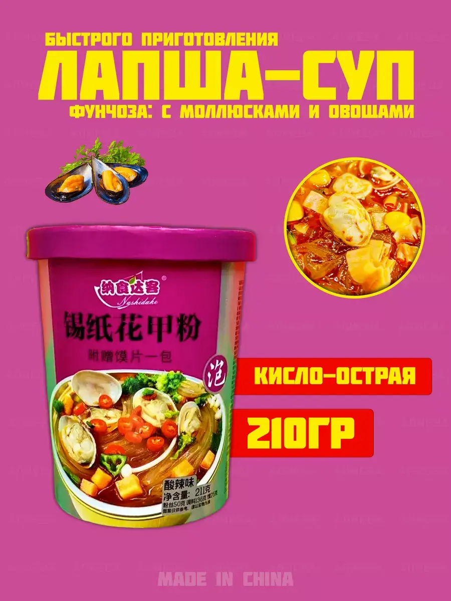 Лапша быстрого приготовления от производителя Гуанхуа, с настоящими мидиями. Оригинальный и не повторимый бульон, много необычных ингридиентов, удобно брать с собой. В фиолетовой упаковке с овощами и моллюсками кисло-острая. В комплектте есть пакетик с житкостью , это и придает остроту . Если не любите острое то добавьте не весь пакет .