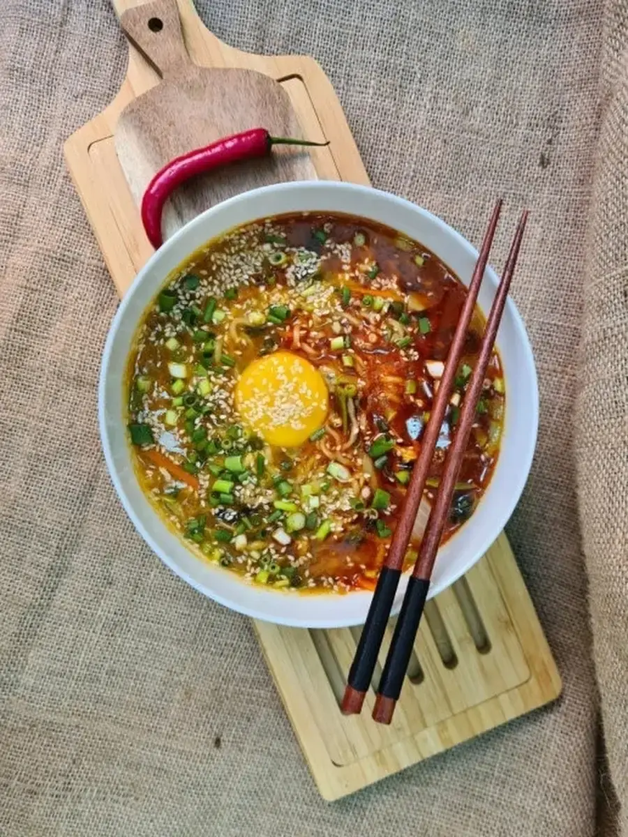 Азиатская кухня привлекательна, экзотична, изобильна по разнообразию продуктов и их сочетанию, что приводит в неподдельный восторг, как её ценителей, так и людей, впервые попробовавших восточные блюда.Рамен - популярное блюдо японской, корейской и китайской кухни. Удивительный вкус пшеничной лапше придаёт мясной или рыбный бульон с различными добавками по вашему желанию и фантазии. Кусочки свинины или говядины, курица или побеги бамбука, шиитаке или зелёный лук, любой соус гармонично дополнят вкусовую палитру.Традиционный корейский суп с кимчи приготовленный с мясом говядины доставит Вам удовольствие своим богатым вкусом кимчи (квашенная пекинская капуста). Способ приготовления: В 550 мл кипящей воды положите лапшу, приправу и сушеные овощи из пакетиков. Варите все вместе 4-5 минут.В данной карточке вы можете приобрести 1 пачку лапшы для пробы . А так же , если вы любитель и ценитель этого рамена то и целую упаковку которая состоит из пяти пачек рамена .