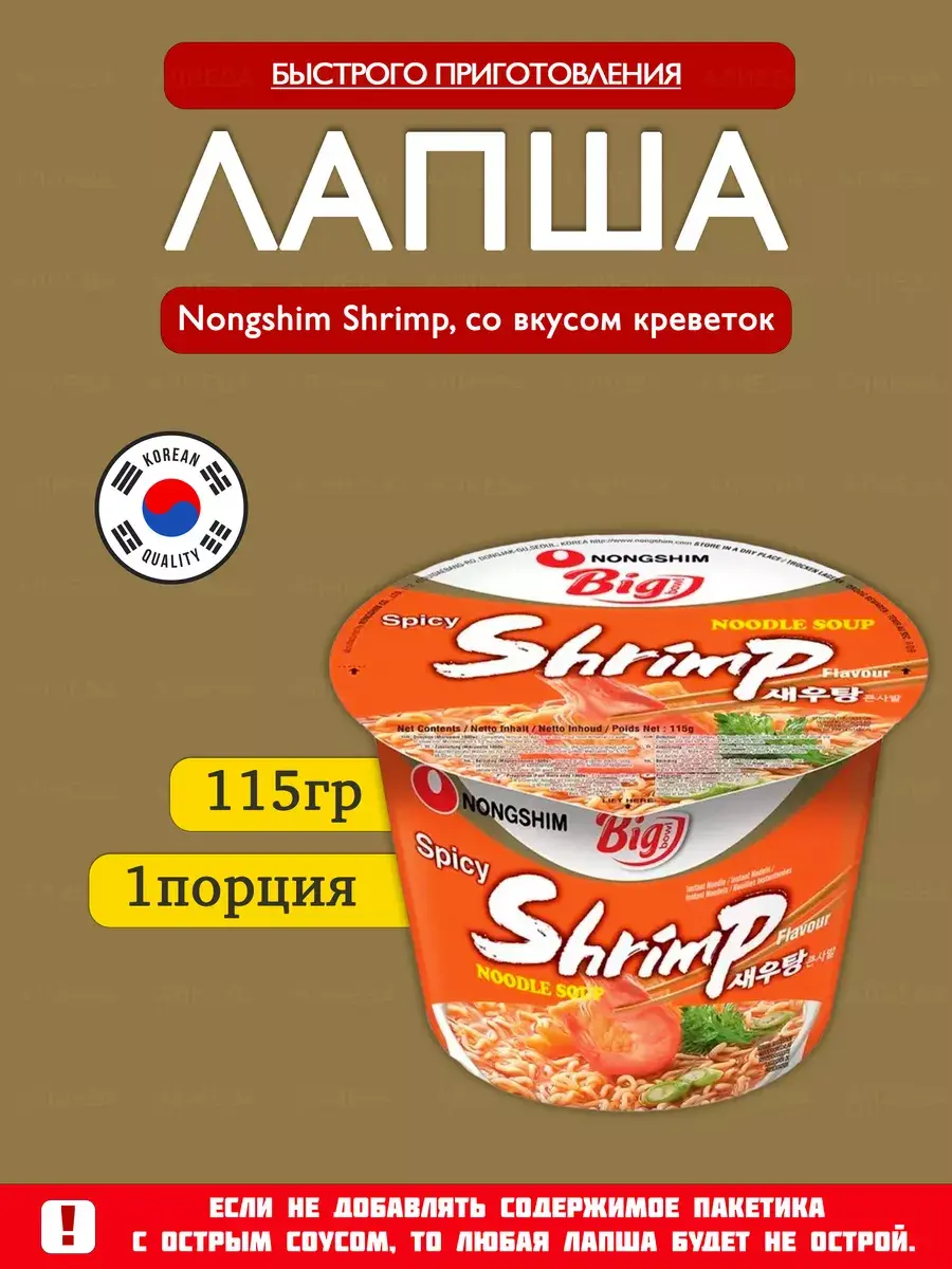 Хотите порадовать себя лакомством, которое наполнит ваш день свежими и аппетитными вкусами? Рекомендуем попробовать лапшу Nongshim Shrimp Big Bowl, со вкусом креветок - идеальный выбор для любителей морепродуктов!