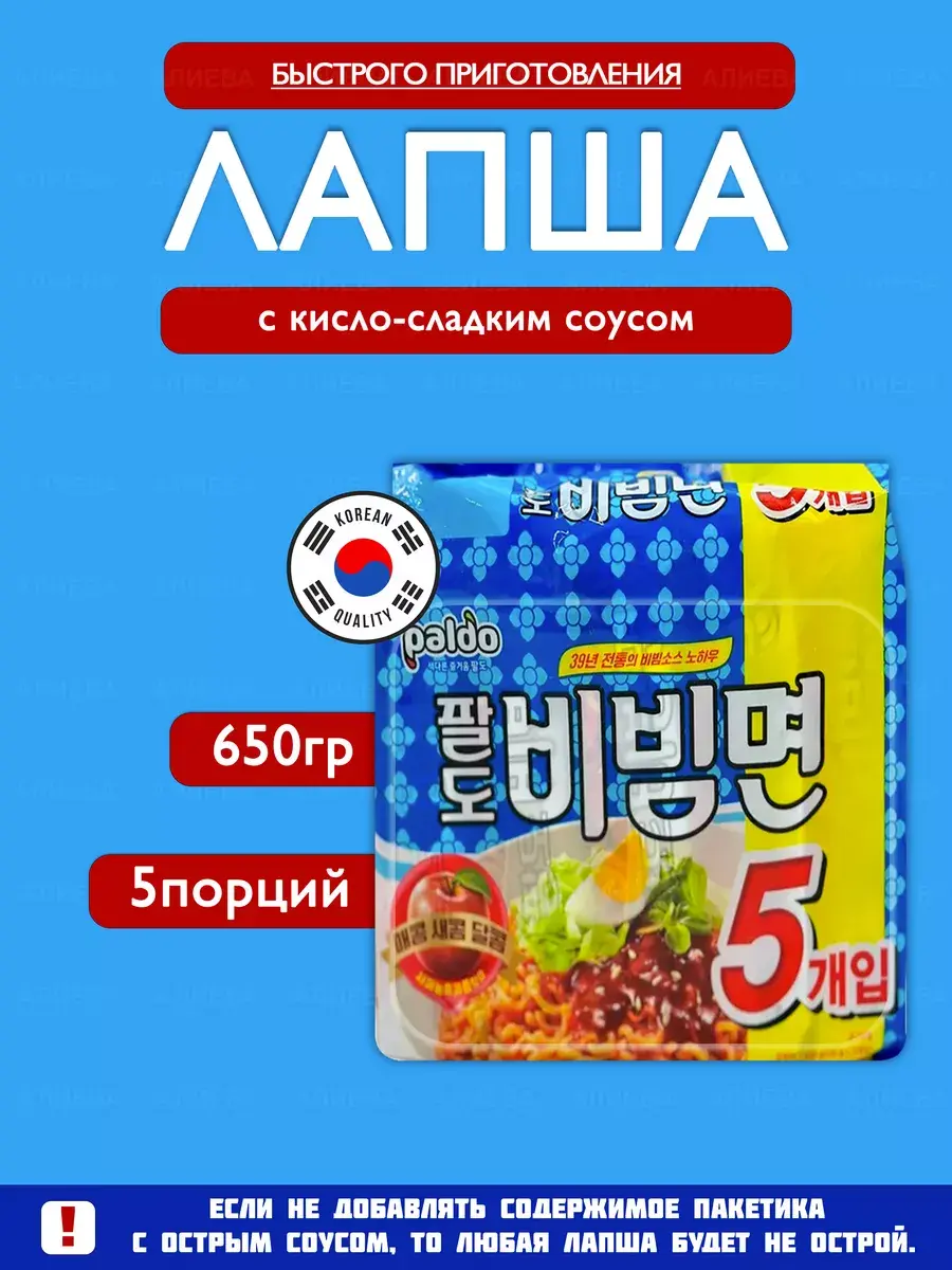 Лапша быстрого приготовления Пибим Мен с кисло-сладким соусом , производство Корея. Пибиммен- традиционная корейская лапша в кисло-сладком соусе. Пибим рамен придётся по нраву всем любителям традиционной корейской кухни. Соус Пибим отличается умеренной остротой и изготавливается из свежих фруктов, заботливо выращенных в экологически-чистой обстановке, и перцовой пасты кочудян. Его ценят за необычный вкус и достаточно густую консистенцию. Сытное, вкусное блюдо.