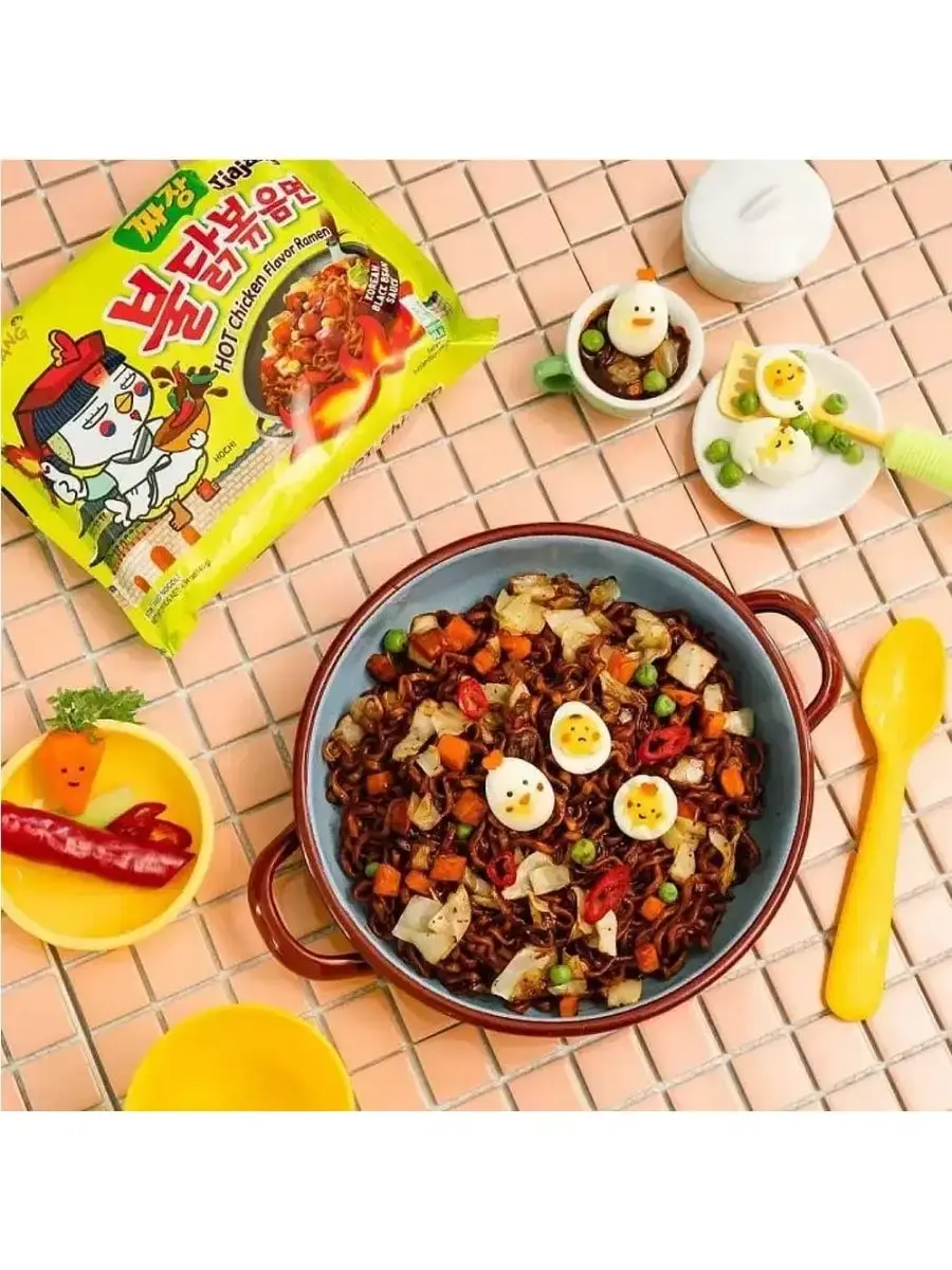 Лапша Samyang со вкусом острой жареной курицы и соусом из бобов. Попробуйте удивительный вкус бобового соуса, от которого вы точно будете в восторге! Устройте себе сытный и вкусный обед вместе с лапшой быстрого приготовления Samyang.1. Положить лапшу в 600 мл. кипящей воды и варить 5 минут.2. Слить воду и оставить 6-8 ложек воды. Добавить соус и тушить 30 секунд.3. Смешать приправы с лапшой.