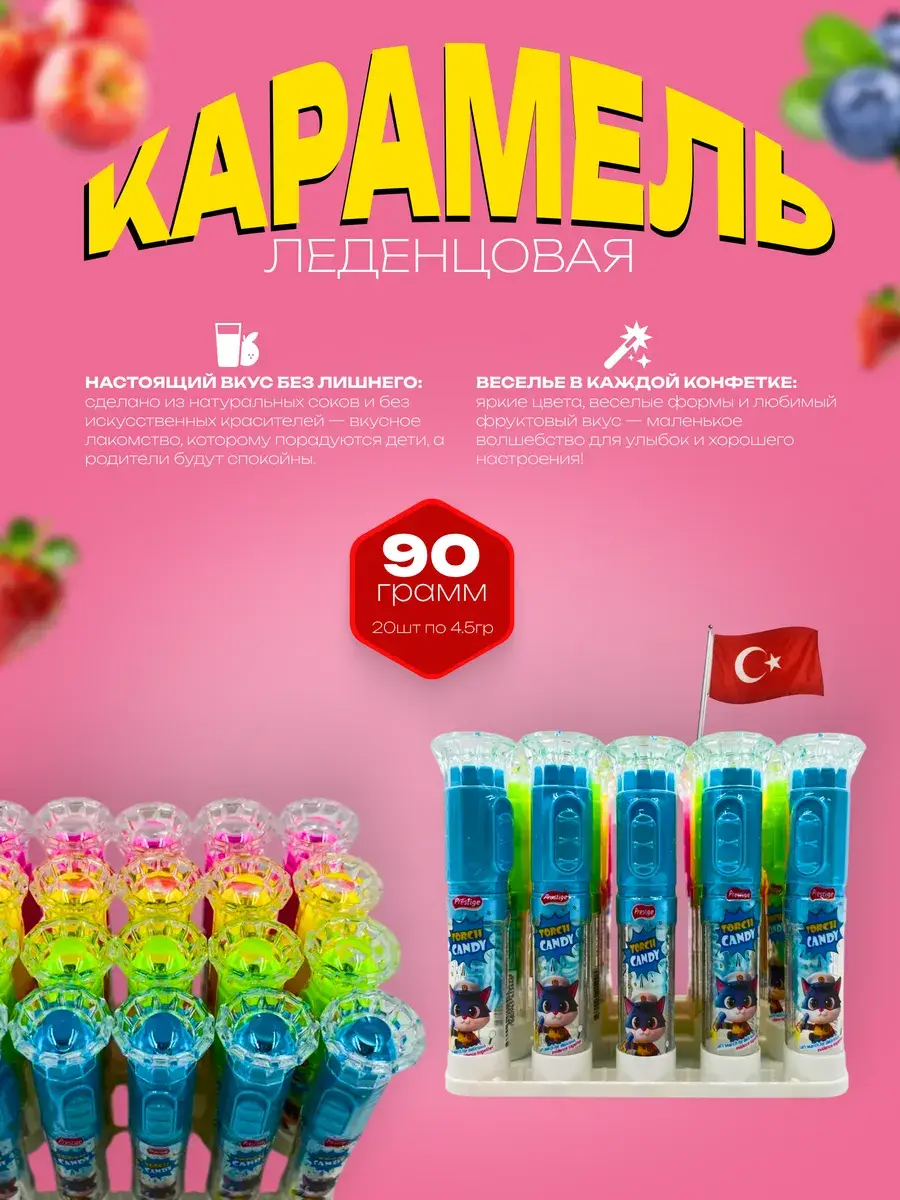 Попробуйте леденцы от турецкого производителя Prestige, которые дарят не только вкус, но и веселую игру. Каждая карамель закреплена на ярком фонарике, который продолжает светить даже после того, как сладость съедена. Сочные вкусы клубники, черники и апельсина делают каждую конфету неповторимым удовольствием. Удобная форма и безопасный дизайн превращают обычный леденец в любимую игрушку ребенка. Подарите малышу двойную радость – сладкое лакомство и веселый фонарик, который будет светить еще долго!