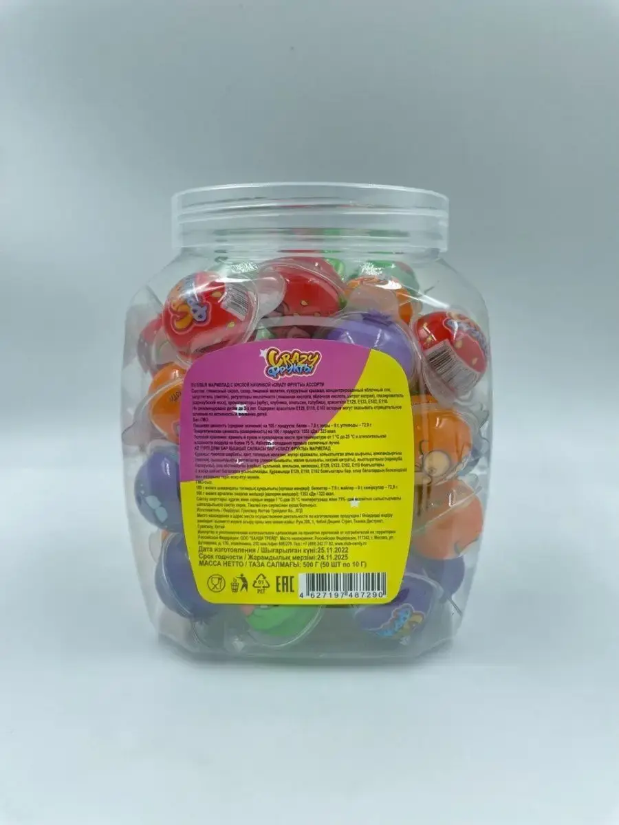 Мармелад Crazy фрукты с кислой начинкой от компании Канди Клаб китайского производства давно радуют своими вкусами не только китайцев, но и весь мир. Не содержат жиров в своем составе. Вес одной банки 300г. Разноцветные фруктовые круглые конфеты со вкусом самых разных фруктов и неповторимым кислым послевкусием не оставят никого равнодушным!