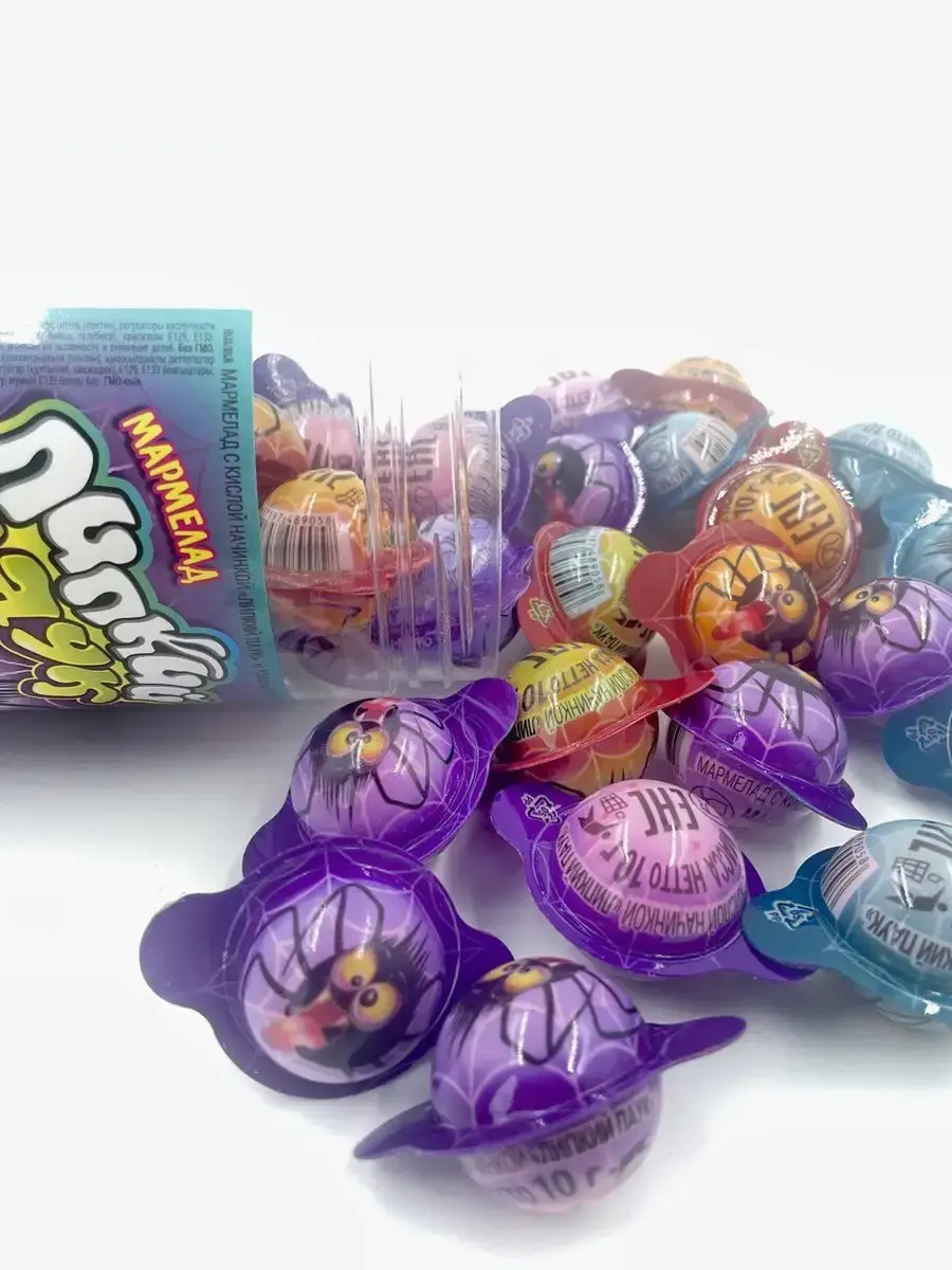 Мармелад в виде паука - заряжает позитивом и бодростью на целый день! Мягкая и сочная консистенция, а также нежный, сливочный, кисло-сладкий вкус покорят вас, в то время как узнаваемые ягодные и фруктовые нотки напомнят о детских беззаботных порах.