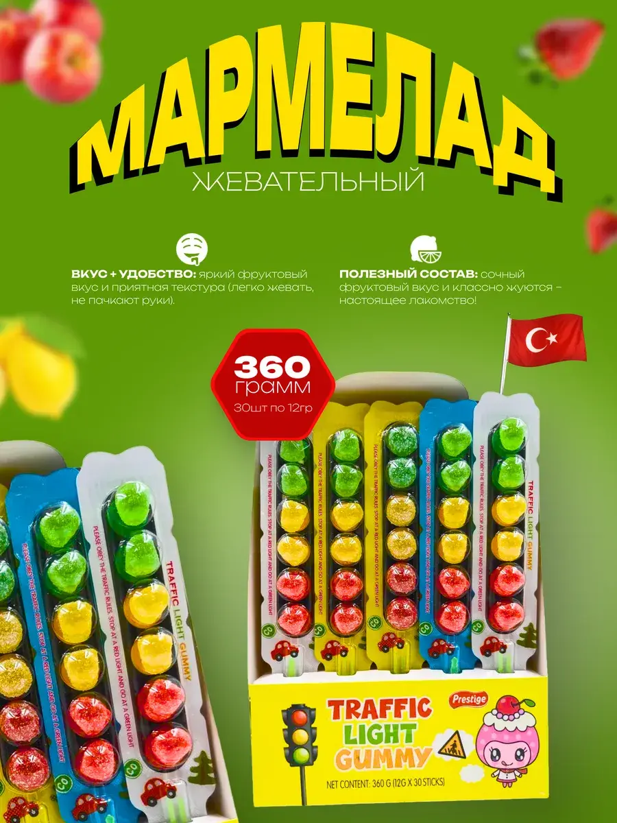 Мармелад в виде светофора порадует детей любого возраста. Под желтым, зеленым и красным цветами скрываются три разных вкуса — лимон, яблоко и клубника соответственно. 30 мармеладных конфе , каждая из которых завернута в полиэтиленовую упаковку. Вкусное лакомство для детей всех возрастов. Эту сладость можно брать с собой куда угодно: на прогулку, в поездку, на природу. А так же преподнести в качестве подарка в школу или детский садик.