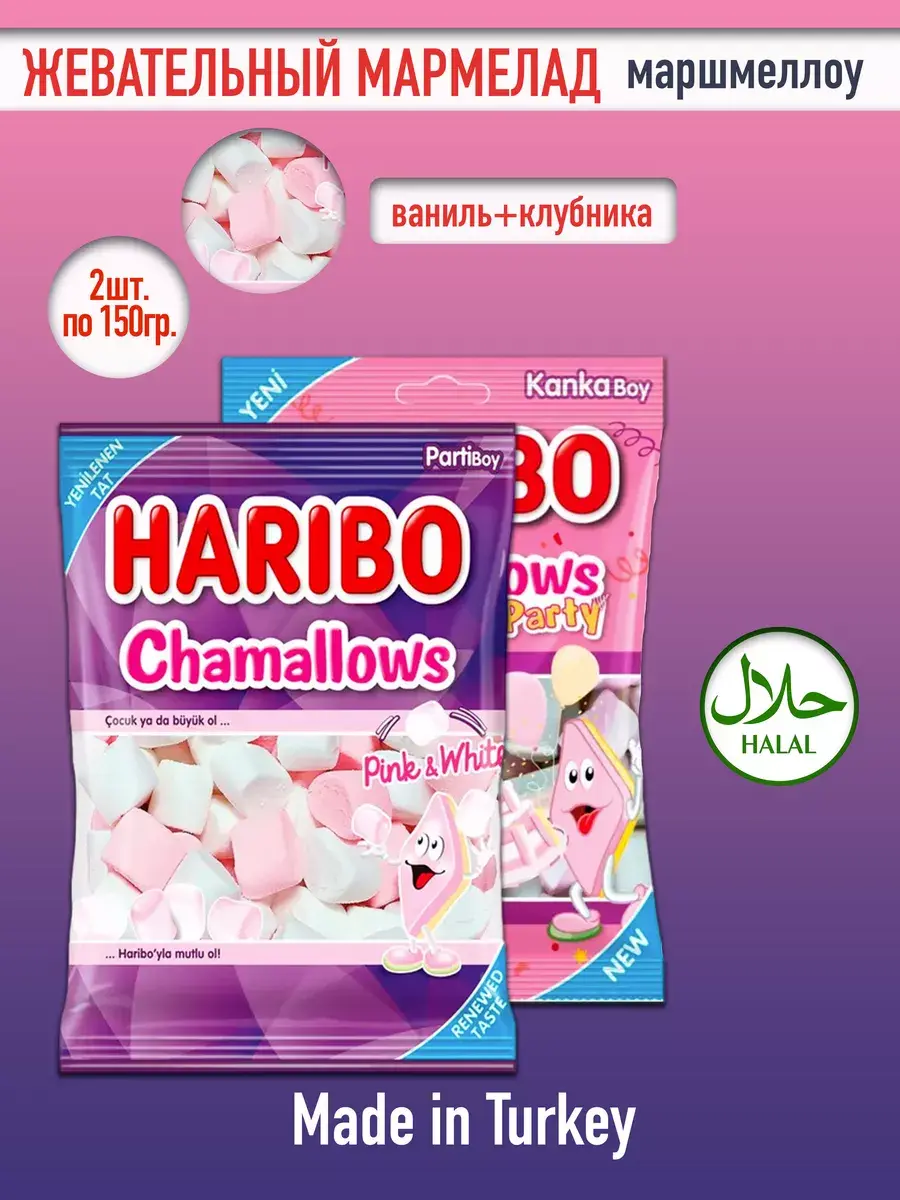 Маршмеллоу Haribo Chamallows Pink & White с ванильным вкусом. Ванильный Маршмеллоу от HARIBO очень нежный на вкус, настоящее воздушное блаженство , можно поджаривать на костре/огне до появления сахарной корочки, класть в кофе для получения зефирной пенки и расплавлять в микроволновке для получения горячей карамельной массы, которую можно намазать на печенье!