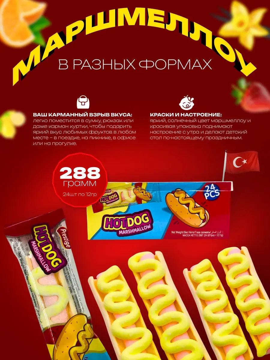 Зефирные Хот-доги от Prestige – изысканное лакомство для настоящих ценителей сладостей. Турецкий производитель Prestige создал уникальный продукт – воздушный зефир в форме хот-догов, который сочетает нежную молочную текстуру и изысканный вкус. Эти зефирные изделия станут идеальным подарком для любого праздника, прекрасным дополнением к чаепитию или оригинальным украшением для десертов.Каждая упаковка содержит 30 крупных зефирок, что делает их отличным выбором для большой компании или детского торжества.