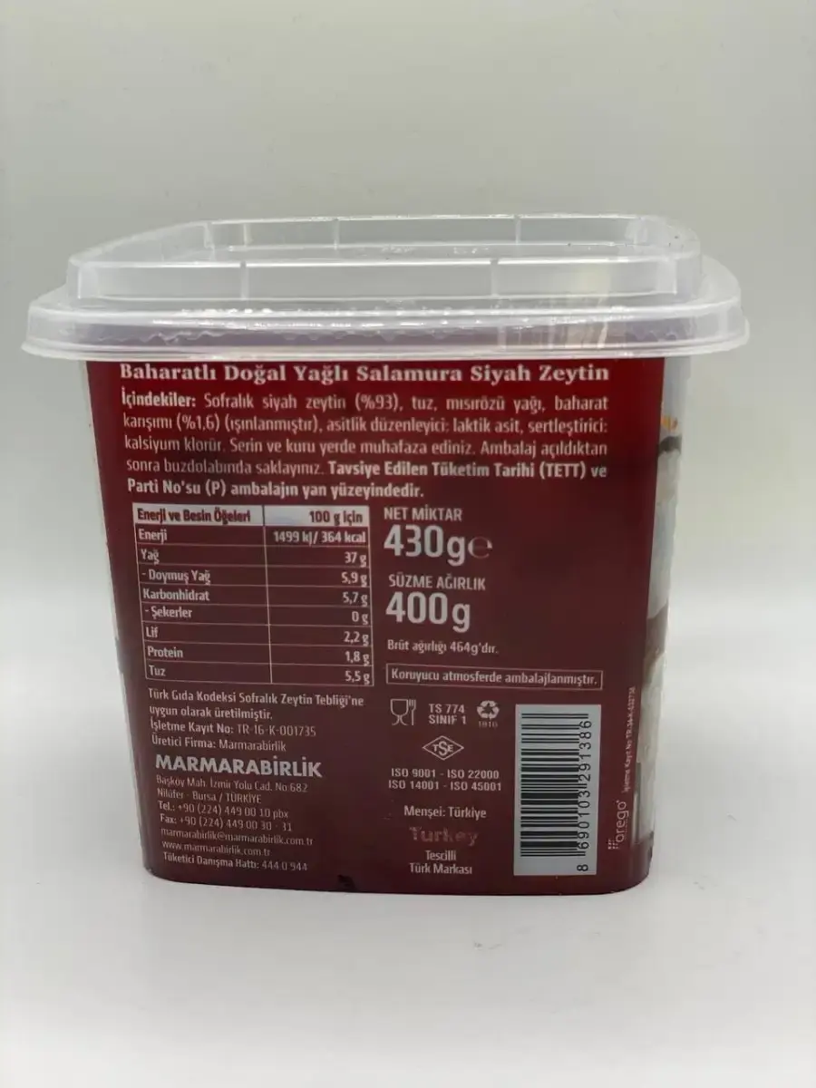 Оливки и маслины из Турции не оставят никого равнодушным, тем более созревшие естественным путем маслины (черные оливки) маринованные в корзинах в специальных специях, они хороши как самостоятельный перекус или закуска, а так же как сбалансированный здоровый натуральный средиземноморский завтрак с творогом, зеленью и свежими овощами. Вяленные маслины (черные оливки) донесут все полезные свойства, подымут настроение и иммунитет. Рецепты с маслинами можно использовать в рецептах солянки с маслинами, оливки с лимоном, маслины и оливки с сыром, черные и зеленые оливки салат и т.д.Внимание оливки и маслины Marmarberlik настолько вкусны и ароматны, что могут вызвать привыкание и зависимость! Бессмысленно описывать вкус маслин и оливок, их нужно покупать и пробовать.