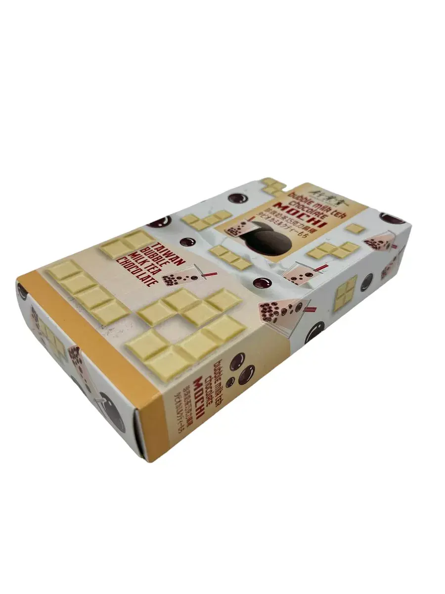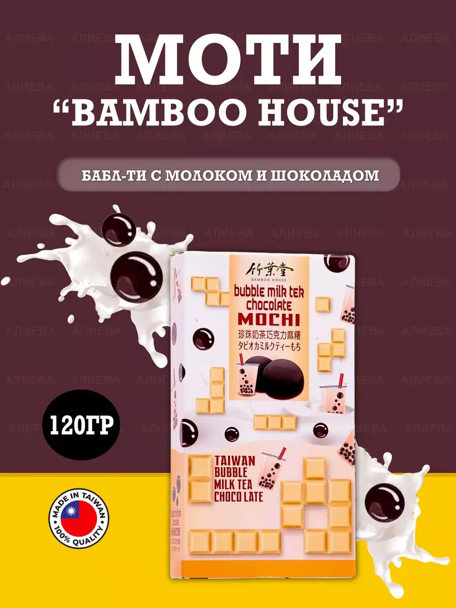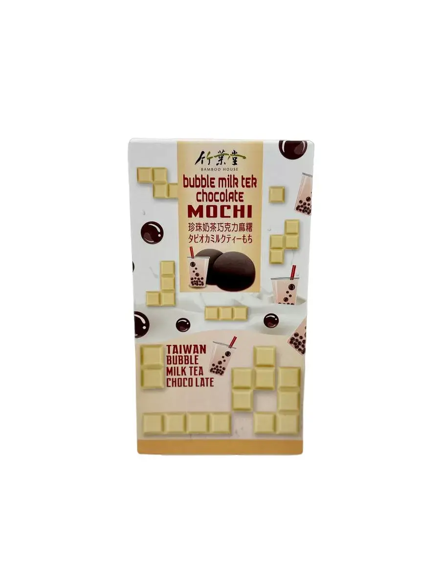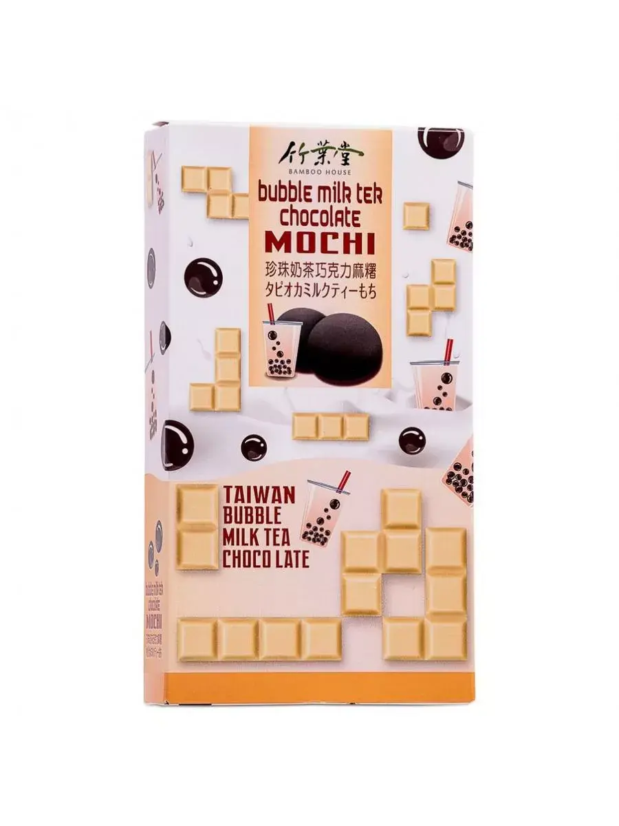 Нежное рисовое тесто с молочно-чайной начинкой, а в середине мягкий шарик тапиоки похожий на мармеладку. Все покрыто шоколадом