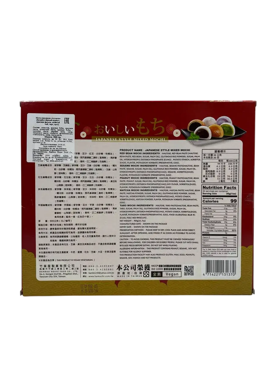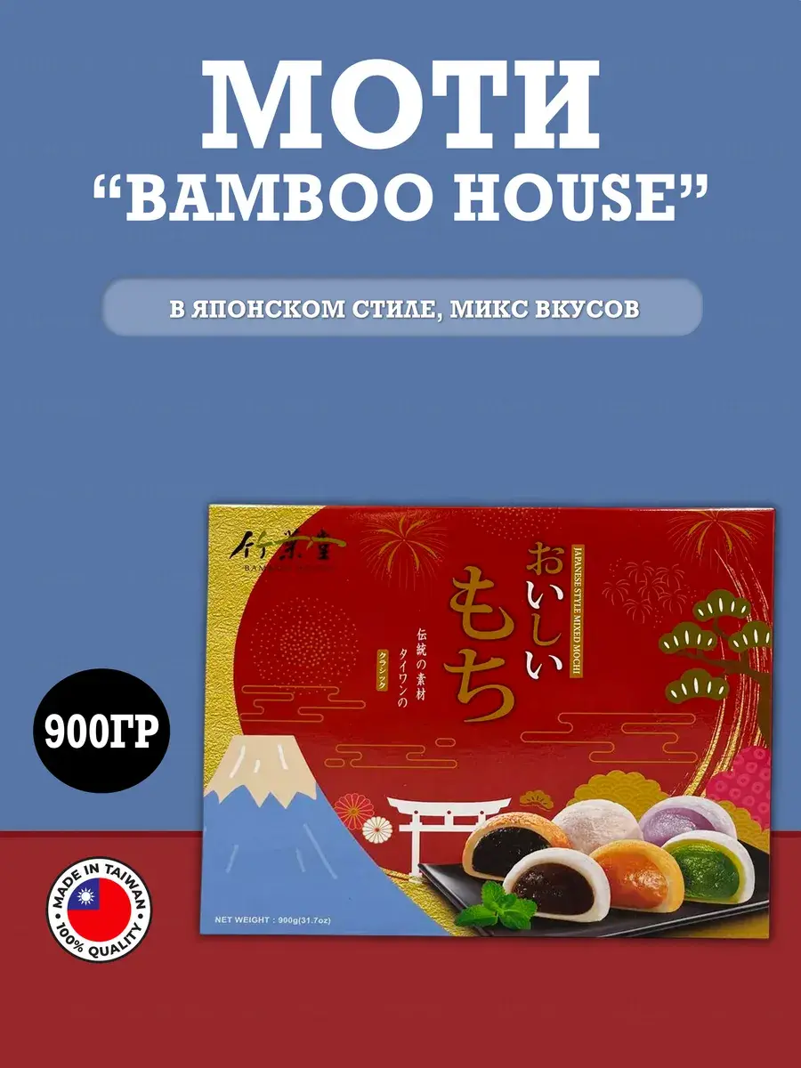 Моти в японском стиле (микс) от торговой марки Bamboo House состоит из рисовых пирожных со вкусом зеленого чая, таро, арахиса, кунжута и красной фасоли адзуки. Это традиционное лакомство, которое будет отлично смотреться на праздничном столе и подойдет в качестве подарка близким.