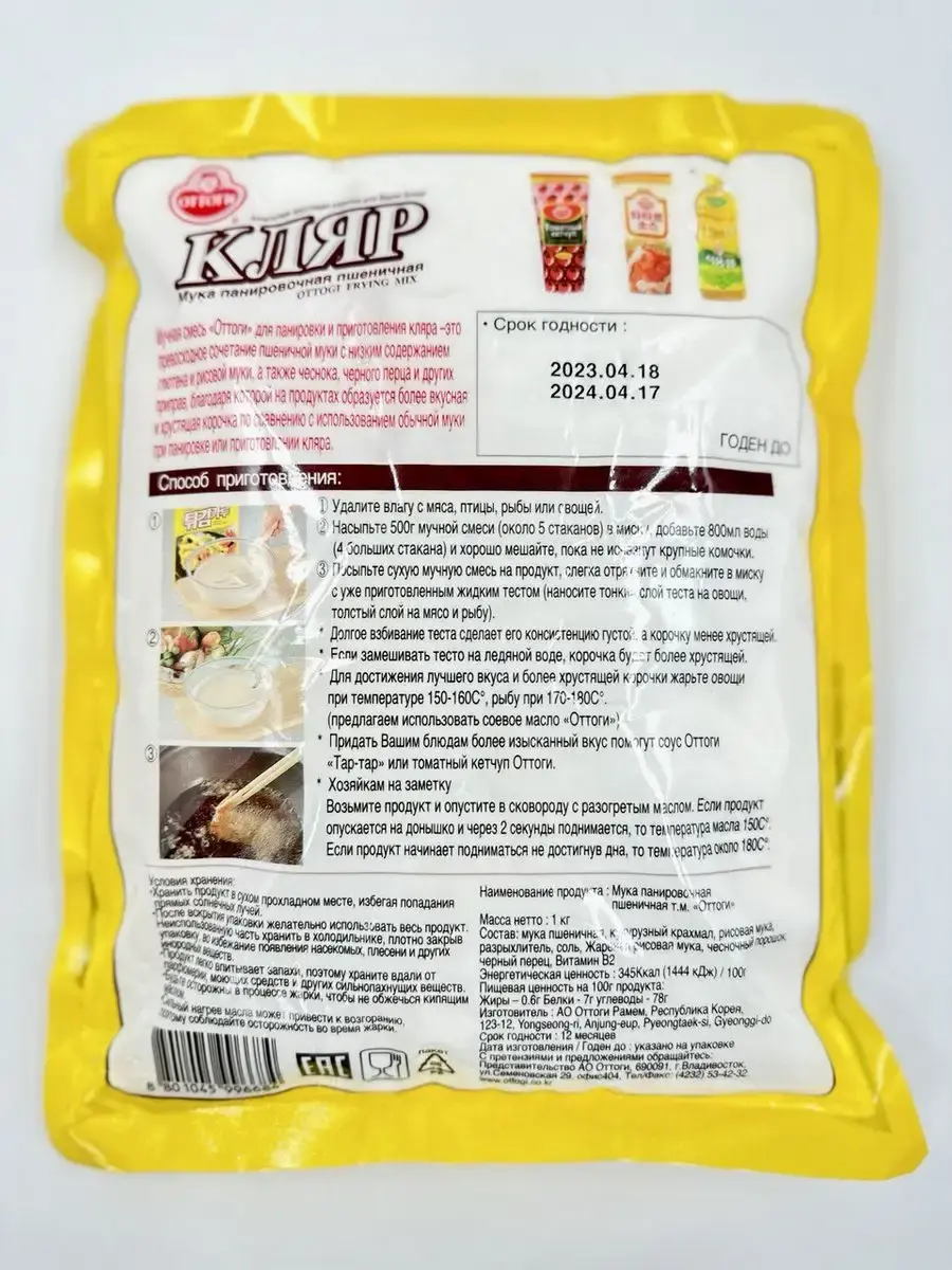 Когда вы выбираете продукцию Ottogi, вы гарантированно получаете шикарный продукт с натуральностью в каждой мельчайшей частице. Кляр Оттоги – это не просто панировочная мука, это настоящее искусство в создании превосходной корочки с неповторимым вкусом. Уникальное сочетание пшеничной муки с низким содержанием глютена и рисовой муки, а также тщательно отобранных чеснока, черного перца и других изысканных приправ создают на продуктах невероятно вкусную и хрустящую корочку, которая станет настоящим украшением вашего блюда.