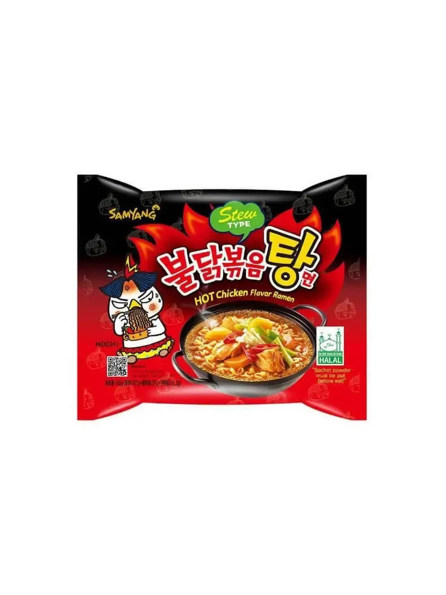 2 Samyang Ramen Stew Type: Самьянг со вкусом острой тушеной курицы. Этот вкус также обладает сильной остротой, но отличается от первого тем, что он имеет более густую консистенцию, похожую на тушеное мясо. Он дополнен богатым вкусом соуса на основе соевого соуса и чеснока, что добавляет ему глубокий и насыщенный вкус.