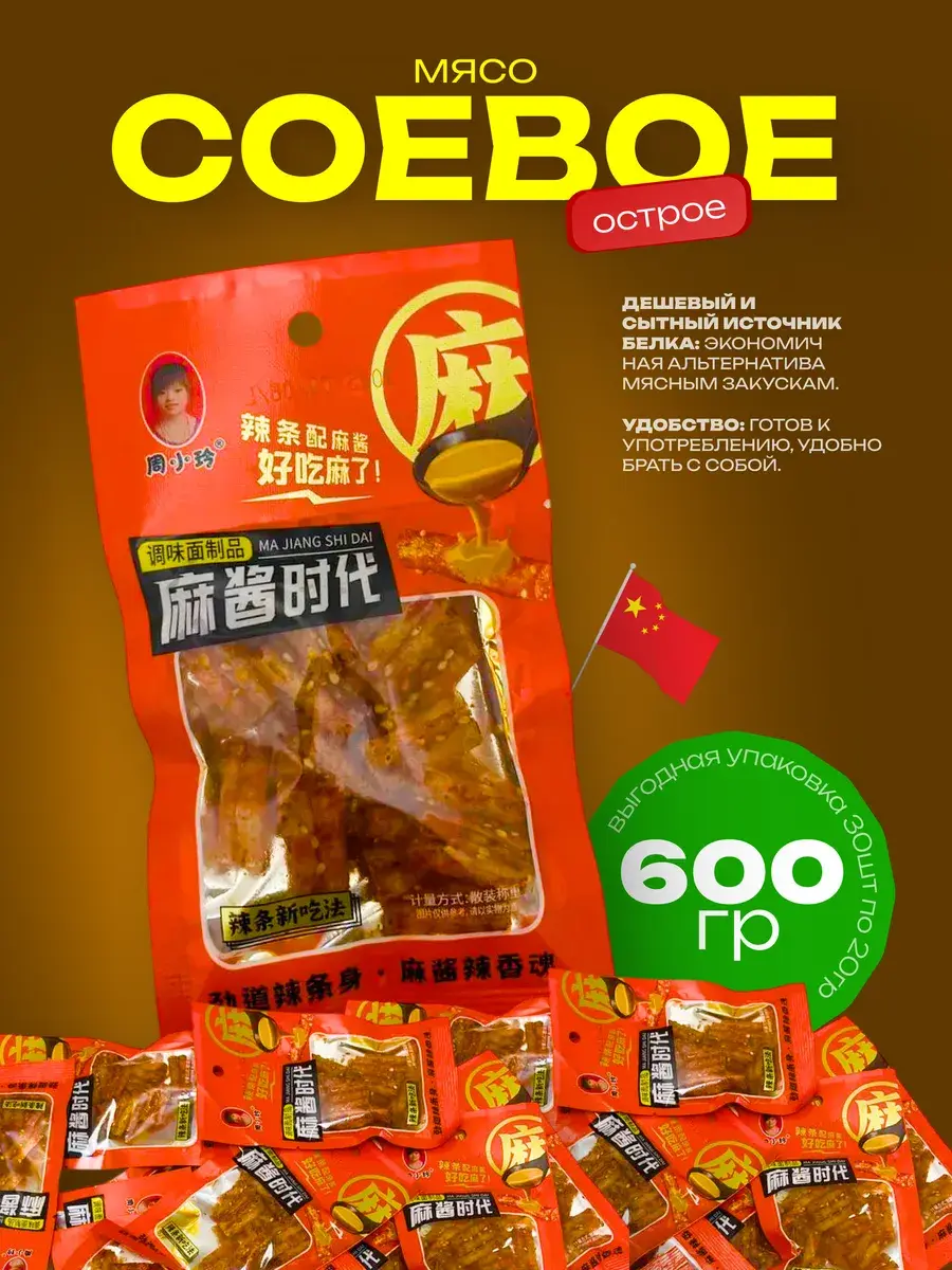 Готовы к взрыву вкусовых рецепторов? Наш китайский снек из соевого мяса создан специально для ценителей по-настоящему острого! Это не просто закуска, а вызов вашему вкусу. Каждый ломтик соевого мяса — это концентрация жгучих перцев, пикантных специй и насыщенного умами. Это острое соевое мясо идеально подойдет для тех, кто любит "погорячее" и ищет новые яркие впечатления. Забудьте о скучных перекусах! Большая упаковка содержит целых 30 порций неукротимого вкуса. Вскройте один пакетик с 20 граммами ломтиков соевого мяса — и ощутите прилив адреналина от этой дерзкой закуски из соевого мяса. Приготовьтесь к огненному шторму в каждой пачке! Идеально для вечеринок, посиделок с друзьями или когда хочется добавить остроты в свой день.