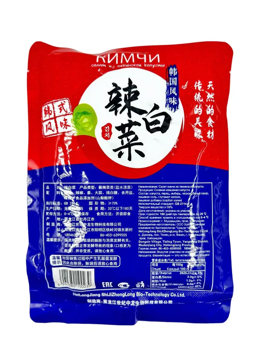 Квашеная пекинская капуста кимчи (кимчхи) в индивидуальной упаковке 500 грамм готова к употреблению. Отлично подойдет любителям азиатской кухни, корейской или китайской. В Корее и Китае квашеную капусту кимчи употребляют как закуску с любым блюдом и каждый день. За счет свойств квашеной капусты, кимчи способствует похудению и улучшению пищеварения. Ценители корейской кухни, конечно, найдут отличия пекинской капусты из Китая, от капусты по традиционному рецепту Кореи. Капуста кимчи имеет срок хранения 10 месяцев, при условии закрытой упаковки. Можно есть сразу или готовить суп кимчи, жареный рис с кимчи, пирог с кимчи. Во время транспортировки кимчи, из-за разниц температур, пакет может вздуться - это является нормой! Кимчи содержит чеснок, имбирь, креветочную пасту и другое, после вскрытия вы почувствуете запах брожения, это не относится к порче продукта! В зависимости от условий и срока хранения, кислотность может меняться.