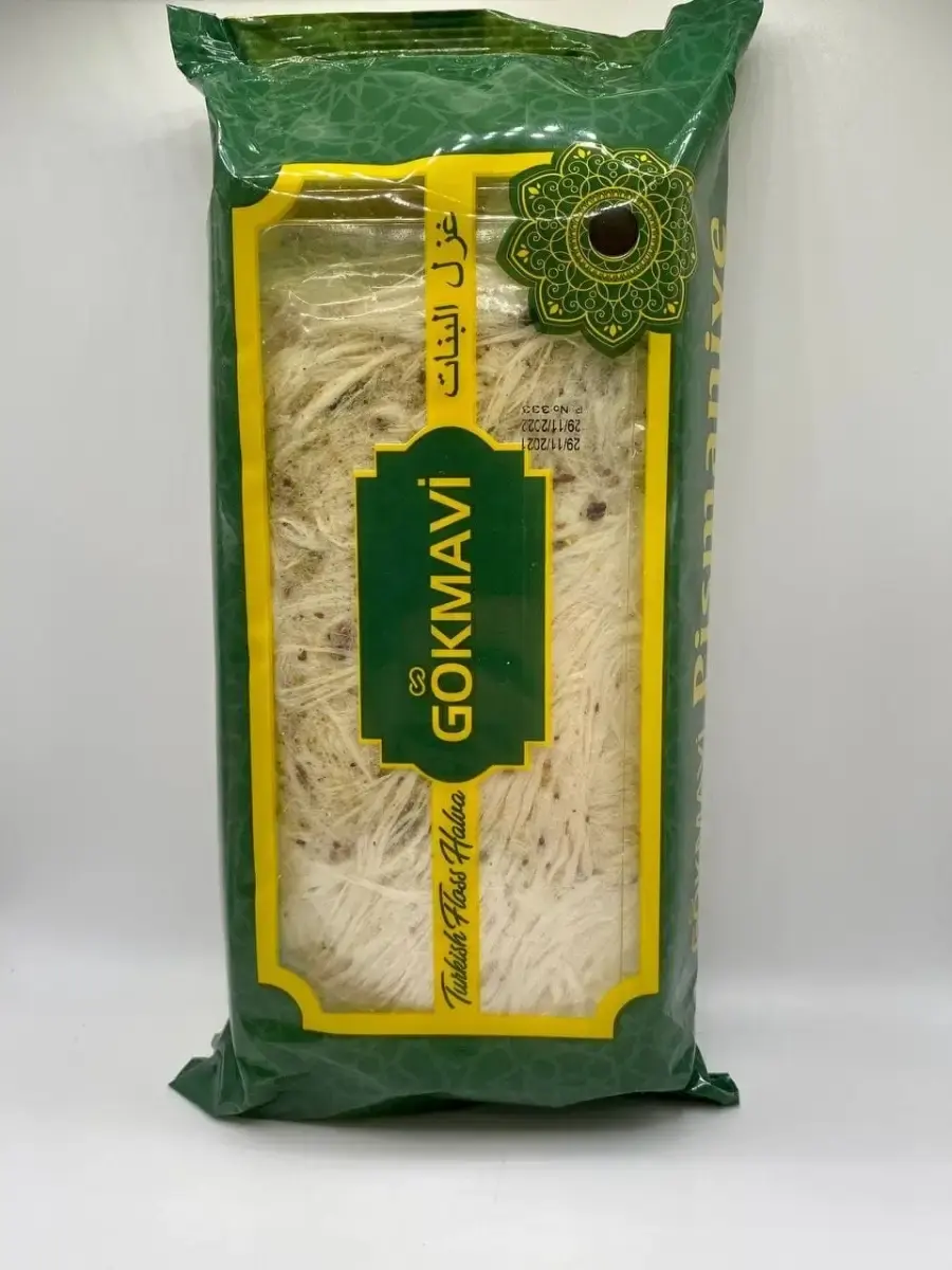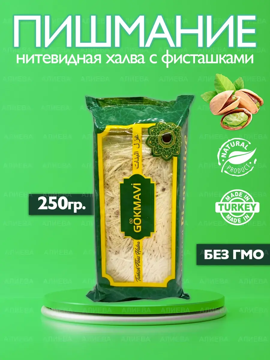 Пишмание, или турецкая халва пользуется популярностью не только на Востоке, но и во всем мире. Этот десерт отличается необычным вкусом и сладостью. По своей воздушной консистенции пишмание напоминает любимую с детства сладкую вату. Однако в отличие от обычной сладкой ваты, пишмание делают из муки и сахара, формируя из ингредиентов тончайшие воздушные нити. Затем в продукт добавляют фисташки, которые придают ореховый вкус и аромат. Хлопковая халва является визитной карточкой Турции. Этот десерт мгновенно тает во рту, за что особо любим детьми. Данная халва не разделена на порционные клубки, а представляет собой цельное облако пишмание. Пластиковая упаковка позволяет дольше сохранить вкус и воздушность турецкой ваты пишмание. Для вашего удобства , в карточке представленны 2 вида пишмание: класическое , ванильное , пишмание с фисташками и гранатовое пишмание с фисташками.