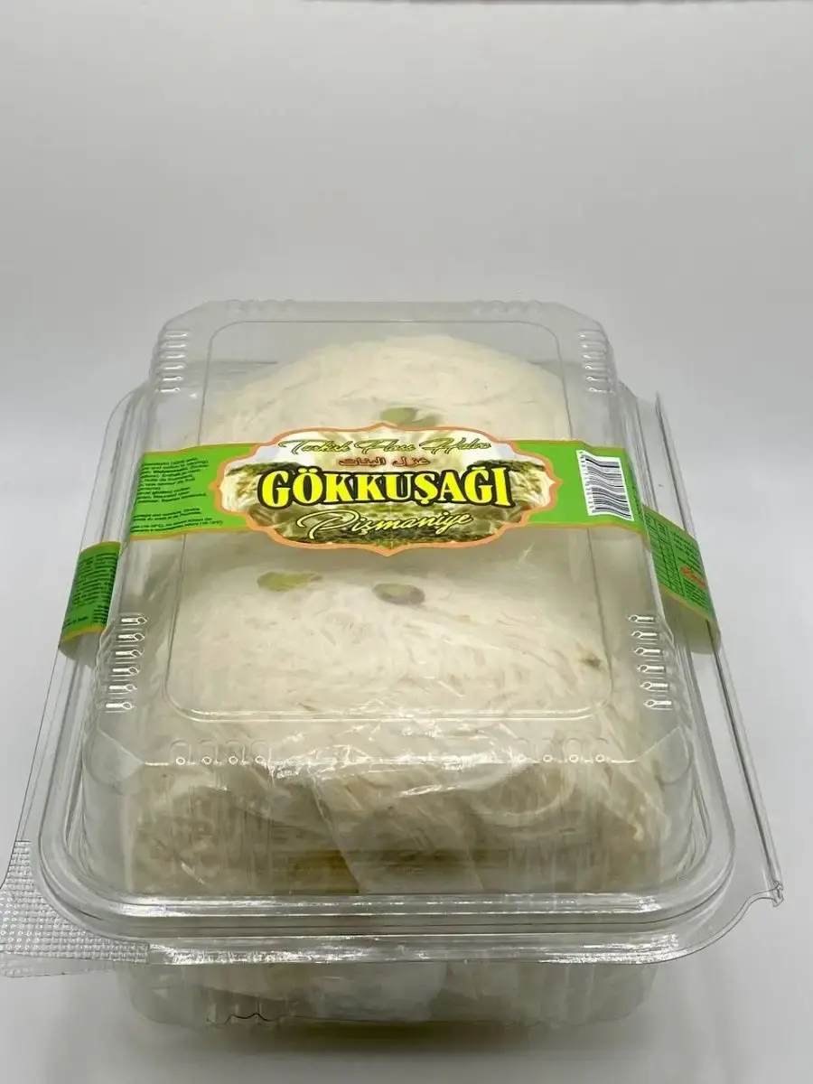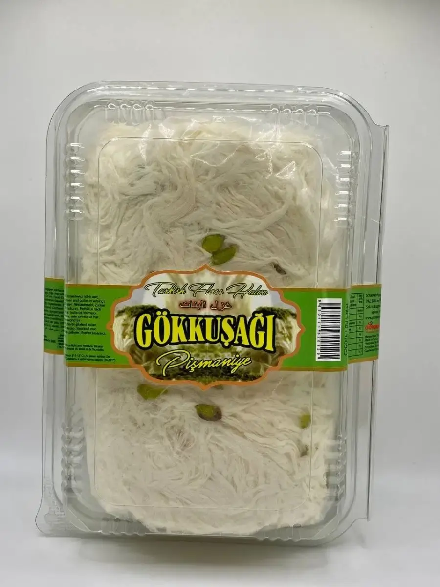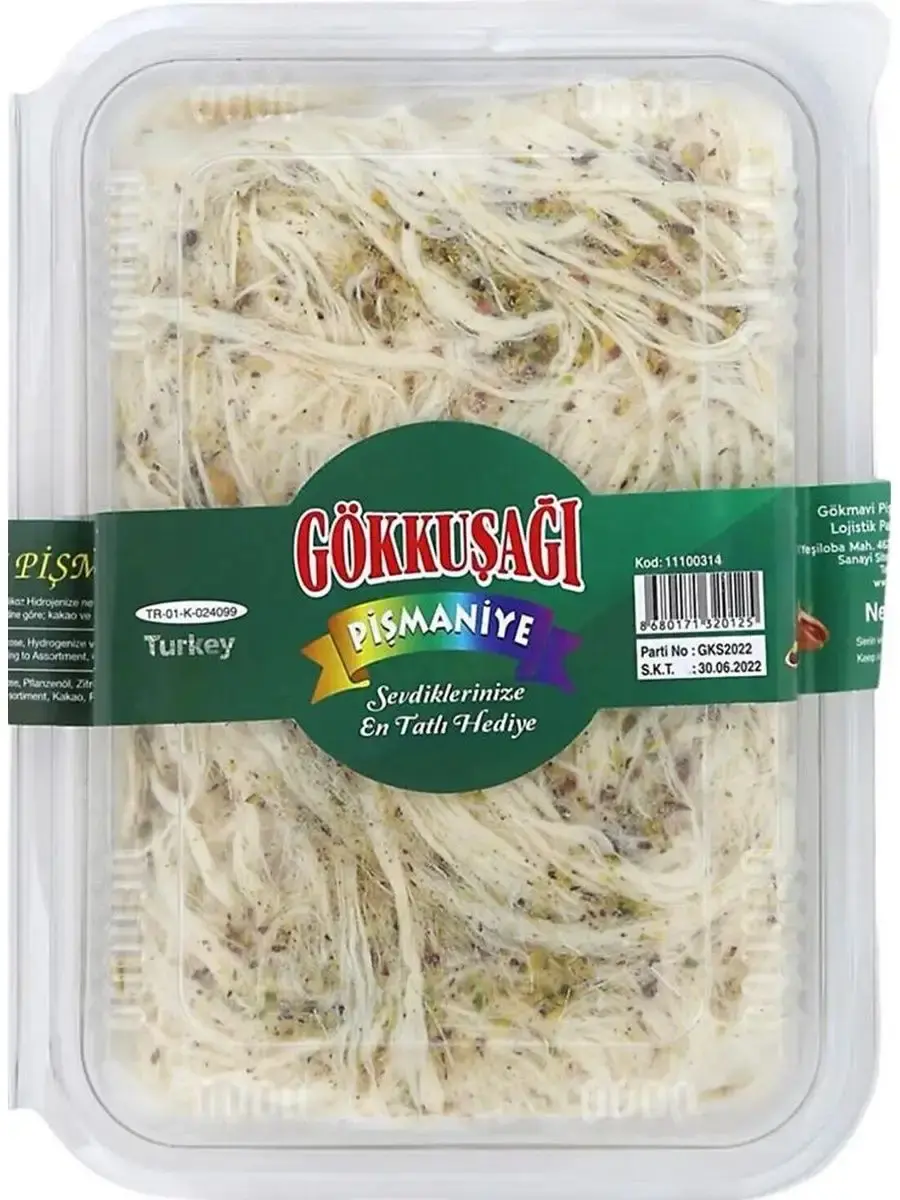 Ищите подарок для сладкоежки? Мы его нашли! Пишмание, или турецкая халва пользуется популярностью не только на Востоке, но и во всем мире. Этот постный продукт отличается необычным вкусом и сладостью. По своей воздушной консистенции пишмание напоминает любимую с детства сладкую вату. Однако в отличие от обычной сладкой ваты, эти восточные сладости делают из муки и сахара, формируя из ингредиентов тончайшие воздушные нити. Затем в этот турецкий продукт добавляют фисташки, которые придают ореховый вкус и аромат. Хлопковая халва пашмак является визитной карточкой Турции. Этот десерт мгновенно тает во рту, за что особо любим детьми. Данная халва не разделена на порционные клубки, а представляет собой цельное облако пишмание с фисташками. Пластиковая упаковка позволяет дольше сохранить вкус и воздушность турецкой ваты пишмание.