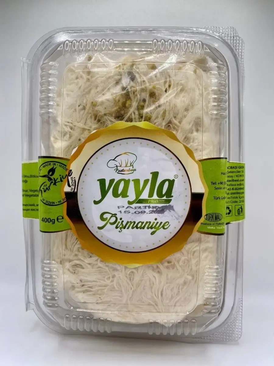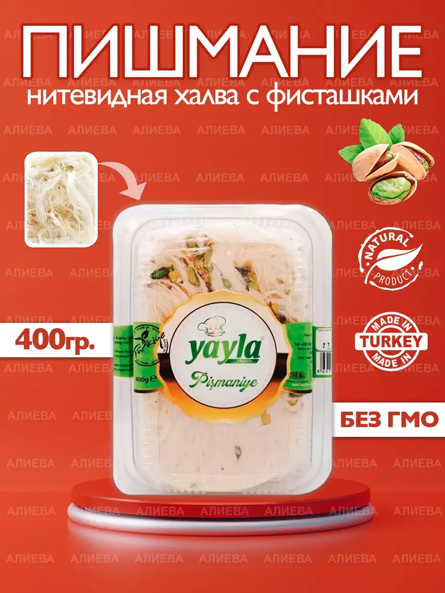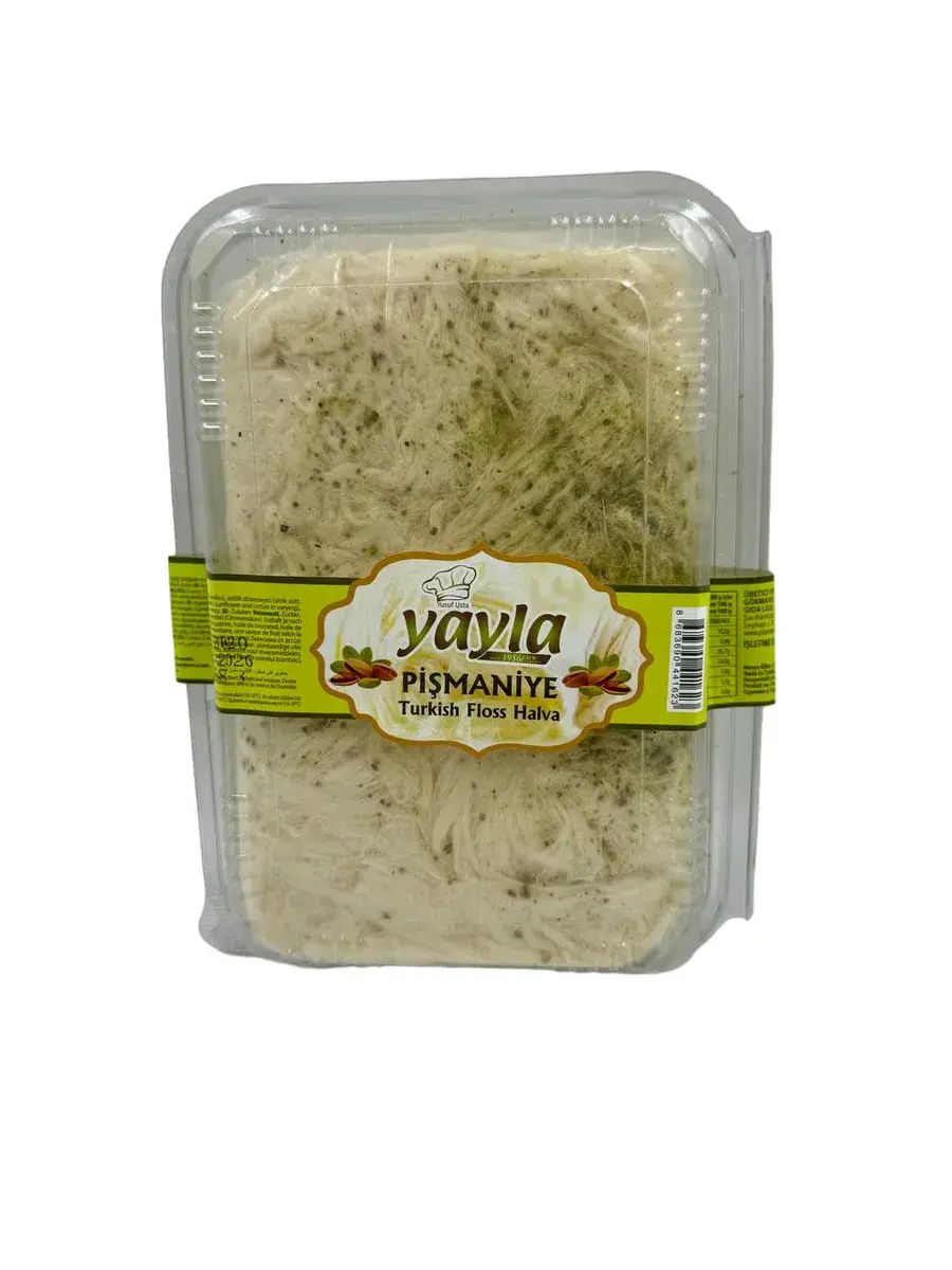Ищите подарок для сладкоежки? Мы его нашли! Пишмание, или турецкая халва пользуется популярностью не только на Востоке, но и во всем мире. Этот постный продукт отличается необычным вкусом и сладостью. По своей воздушной консистенции пишмание напоминает любимую с детства сладкую вату. Однако в отличие от обычной сладкой ваты, эти восточные сладости делают из муки и сахара, формируя из ингредиентов тончайшие воздушные нити. Затем в этот турецкий продукт добавляют фисташки, которые придают ореховый вкус и аромат. Хлопковая халва пашмак является визитной карточкой Турции. Этот десерт мгновенно тает во рту, за что особо любим детьми. Данная халва не разделена на порционные клубки, а представляет собой цельное облако пишмание с фисташками. Пластиковая упаковка позволяет дольше сохранить вкус и воздушность турецкой ваты пишмание.