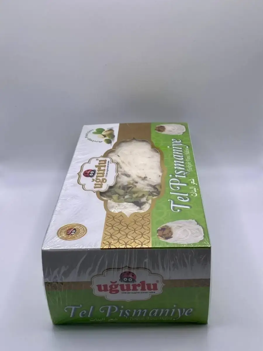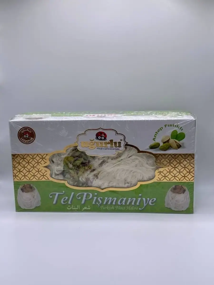 Легкий воздушный вкус настоящего Турецкого пишмание, премиум класса Ugurlu с фисташками унесет вас на вершину блаженства. Как называется Турецкая халва воздушная, халва волокнами, сладкая вата, халва хлопковая, халва ниточками и на много подобные вопросы ответ одинаковый, это все пишмание.
