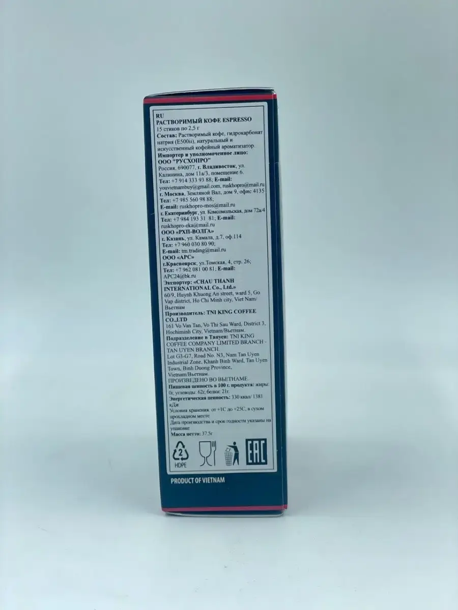 Добро пожаловать в мир настоящего эспрессо! King Coffee Espresso (Кинг Кофе Эспрессо) - вьетнамский кофе растворимый в пакетиках, который воплощает в себе лучшее от Востока и Европы. Созданный на основе ноу-хау с Востока и технологии экстракции из Европы, этот кофе обладает крепким и полным вкусом, достойным свежесваренного итальянского эспрессо.