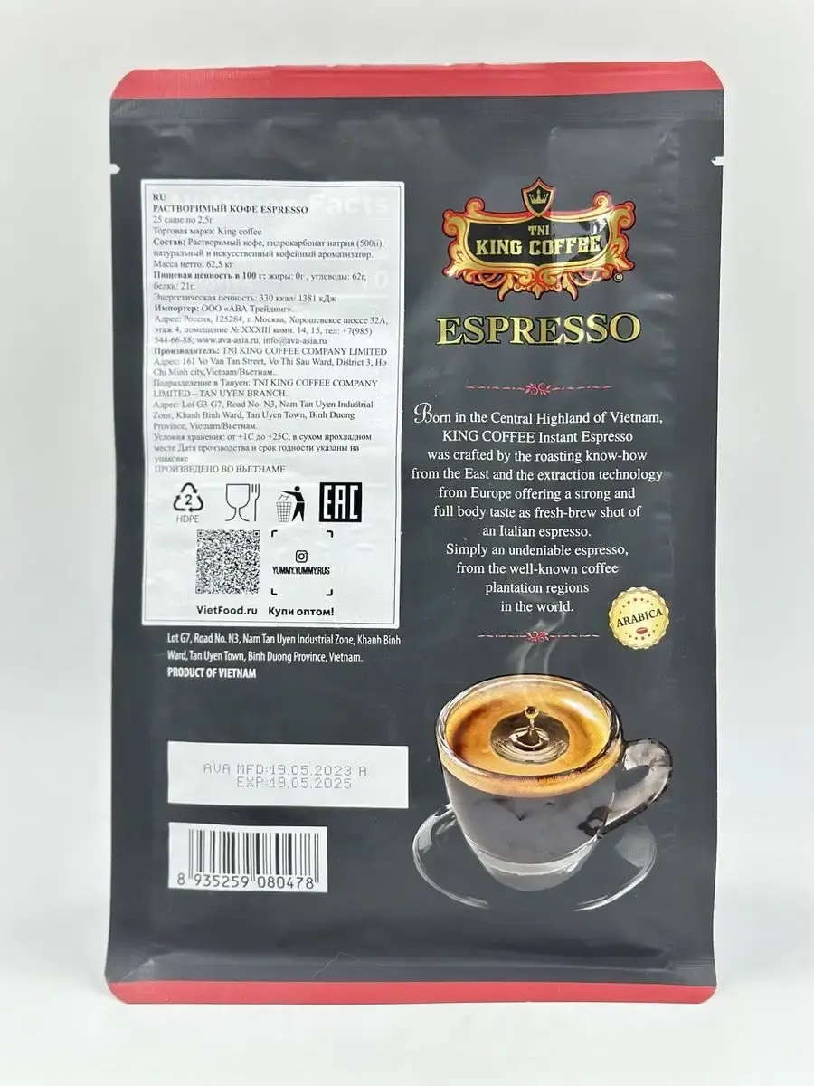 Добро пожаловать в мир настоящего эспрессо! King Coffee Espresso (Кинг Кофе Эспрессо) - это вьетнамский растворимый кофе в удобных пакетиках, который сочетает лучшие черты Востока и Европы. Сочетая в себе ноу-хау Востока и технологию экстракции из Европы, этот кофе предлагает крепкий и насыщенный вкус, который сравним с свежесваренным итальянским эспрессо.