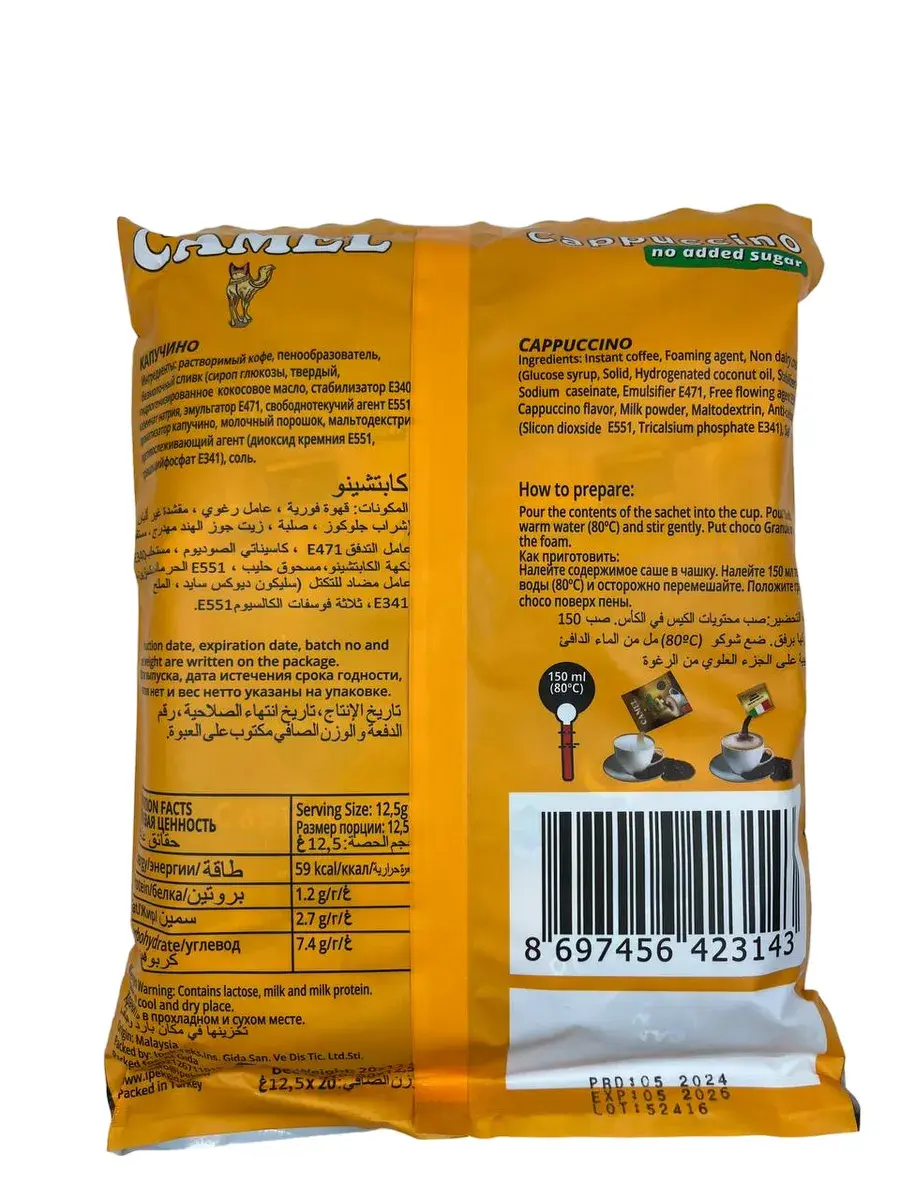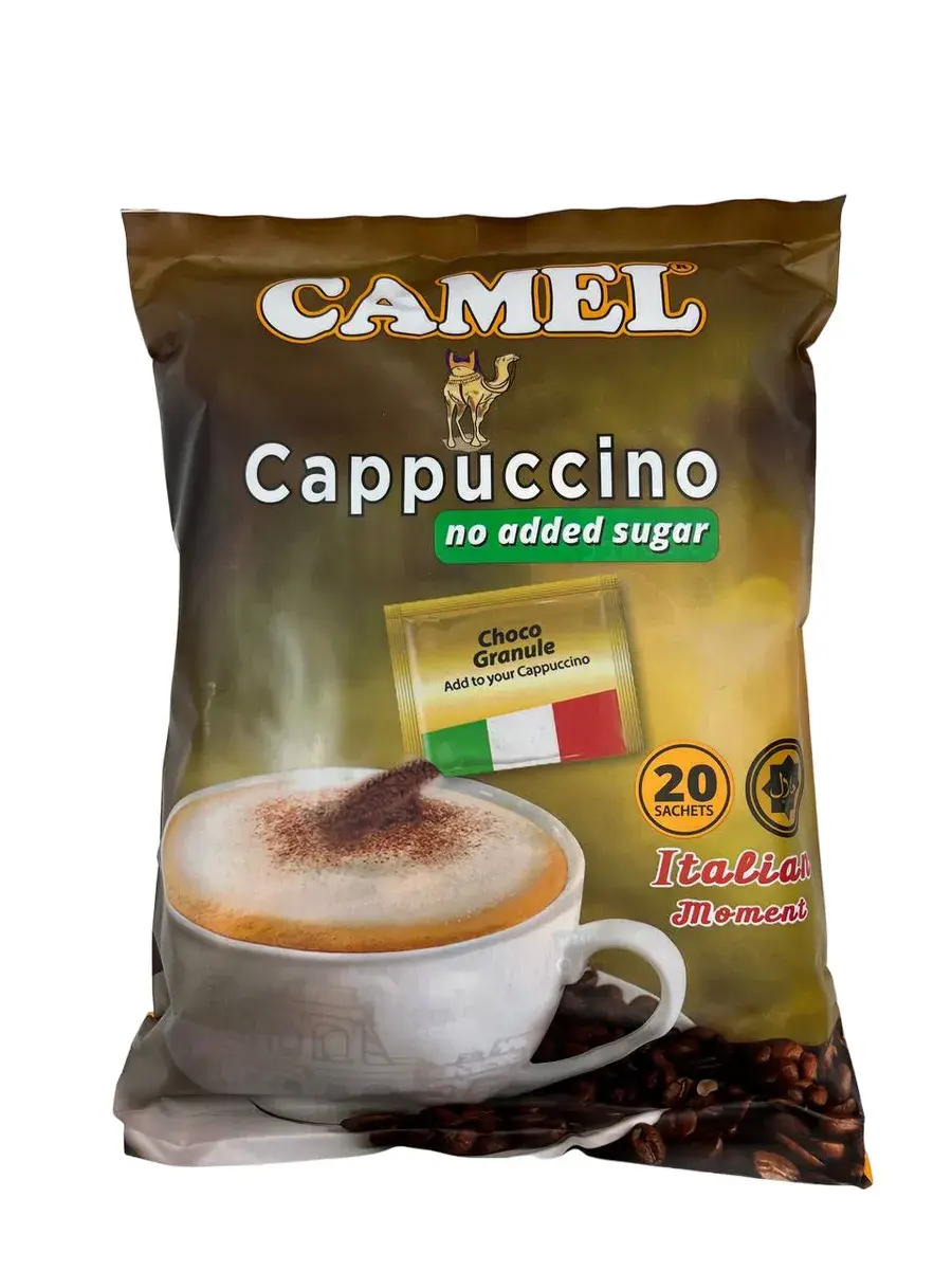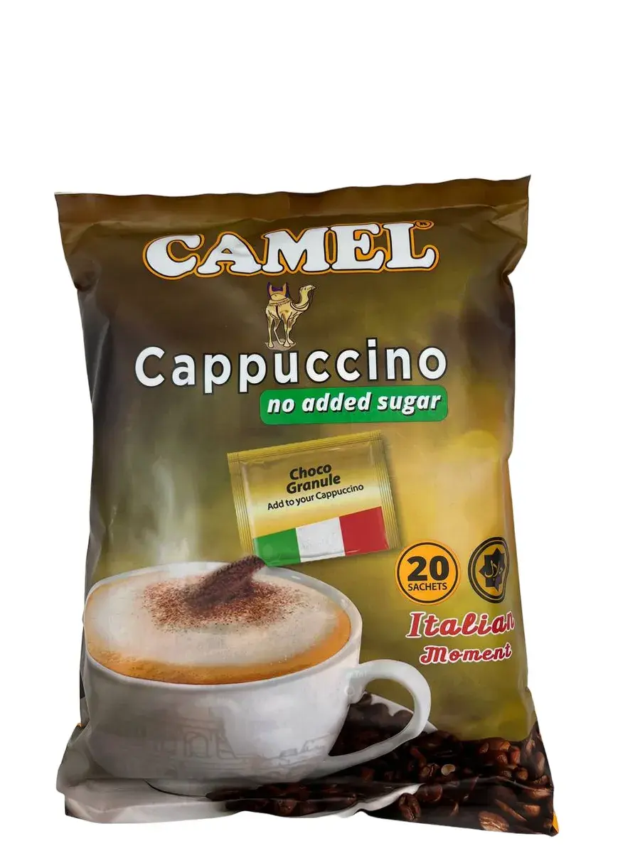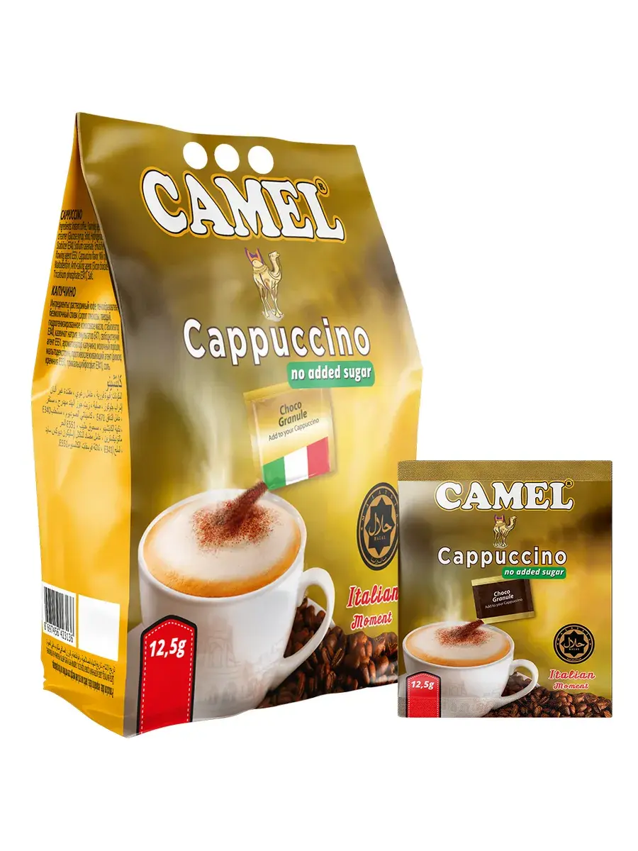 Растворимый кофе капучино без сахара от турецкого производителя чайных напитков Camel extra choco granule. Насыщенный аромат и богатый вкус. В каждой упаковке 20 порций по 12.5 грамм, что делает растворимый капучино идеальным напитком для офиса, дома или путешествий. в упаковке есть удобный формат, что позволяет быстро и легко приготовить вкусный кофе. Попробуйте растворимый капучино и наслаждайтесь богатым вкусом.