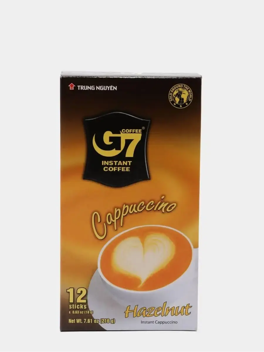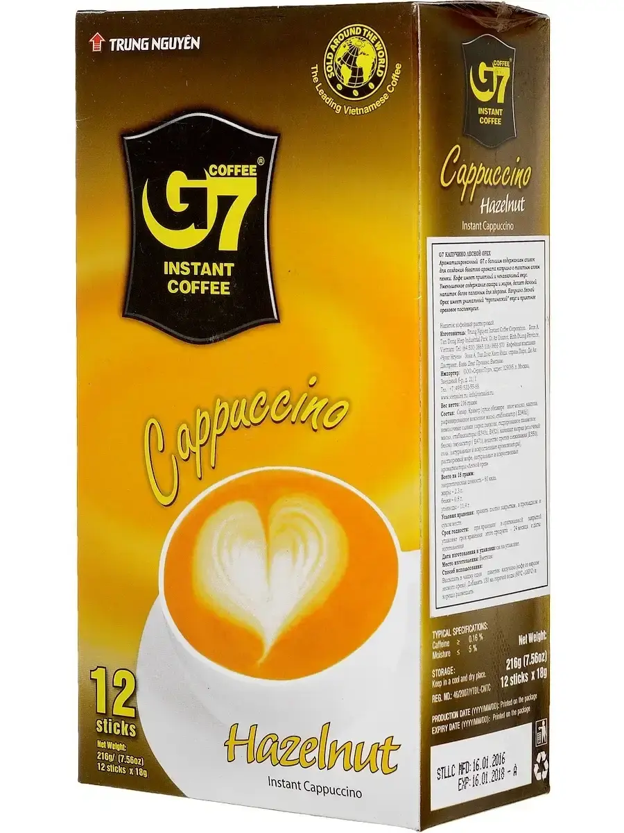 Для вашего удобства, в данной карточке вы можете приобрести : Trung Nguyen G7 Cappuccino Мокка , Cappuccino Hazelnut . Ароматизированный кофе Trung Nguyen G7 Cappuccino Мокка с большим содержанием сливок, идеально подходит для создания богатого аромата капучино с толстым слоем пенки. Этот растворимый кофе имеет приятный и ненавязчивый вкус. Уменьшенное содержание сахара и жиров, делает данный напиток более полезным для здоровья. Trung Nguyen G7 Cappuccino со вкусом Мокка обладает приятными нотками какао во вкусе.Cappuccino Hazelnut -быстрая альтернатива любимому многим капучино с нежной пенкой и мягким ароматом лесного ореха.Вьетнамский кофе давно прославился на весь мир благодаря своему необычному вкусу и пленяющему аромату. Многие, кто пробовали этот напиток, отмечают его необыкновенность и оригинальный, не похожий на другие, вкус. И это неудивительно, так как кофе у многих людей ассоциируется именно с Вьетнамом, откройте для себя насыщенный вкус настоящего кофе из Вьетнама!