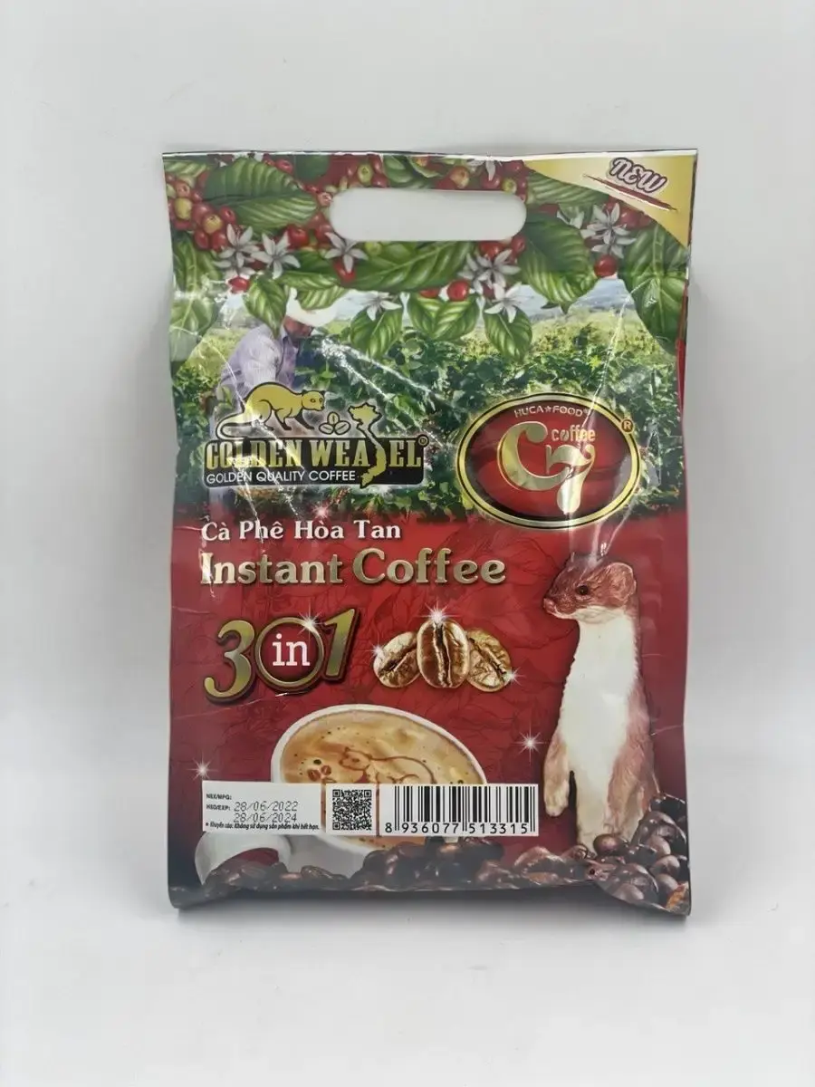 Растворимый вьетнамский кофе 3in1 Golden Weasel C7 50 sticks HUCAFOOD – практичная упаковка полюбившегося 100% натуральный кофе с добавлением сахара и молока. Это один из самых популярных продуктов среди почитателей быстрого и натурального кофе. Растворимый кофе из Вьетнама получен из кофейных зерен, выращенных на знаменитых базальтовых почвах легендарной провинции Дак Лак близ Буон Ми Туот. Голден Визел Инстант 3 в 1 сочетает в себе секреты натурального кофе и самые современные технологии производства. Продукция линейки C7 имеет отличительный знак золотой ласки, знаменитой своей причастностью к производству кофе Копи Лювак. Продукция Hucafood С7 обладает высоким качеством и выразительными натуральными вкусовыми характеристиками традиционного вьетнамского кофе. Способ приготовления растворимого кофе 3in1 Golden Weasel C7 - Huca Food, рекомендованный производителем: для получения горячего напитка: В 70 мл горячей воды добавить 1 саше растворимого кофе 3 в 1 и тщательно перемешать. Вспенив напиток, Вы получите готовый капучино с плотной аппетитной пенкой. Для приготовления освежающего холодного напитка: В 60 мл горячей воды растворить 2 саше кофе 3 в 1, добавить лед. Бодрящий и вкусный холодный кофе готов!Hucafood – golden weasel instant coffe 3 в 1 – ароматный напиток с мягким сливочным вкусом натурального кофе, сладостью и с шоколадными нотками. Во Вьетнаме принято пить очень насыщенные напитки. При желании Вы можете смягчить вкус, добавив большее количество воды.