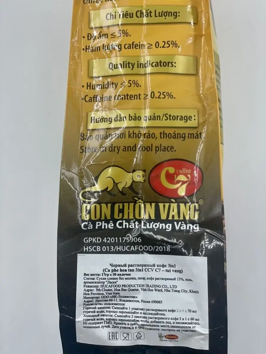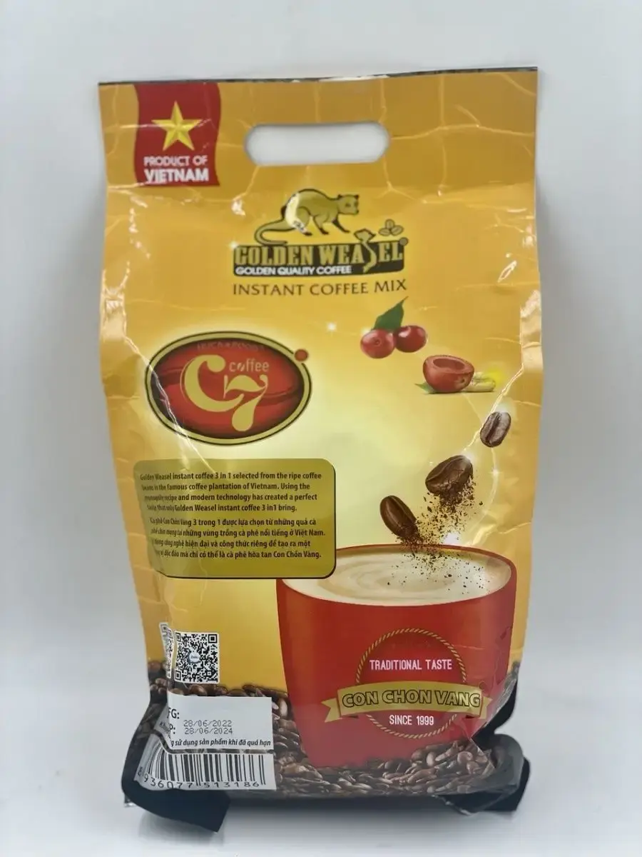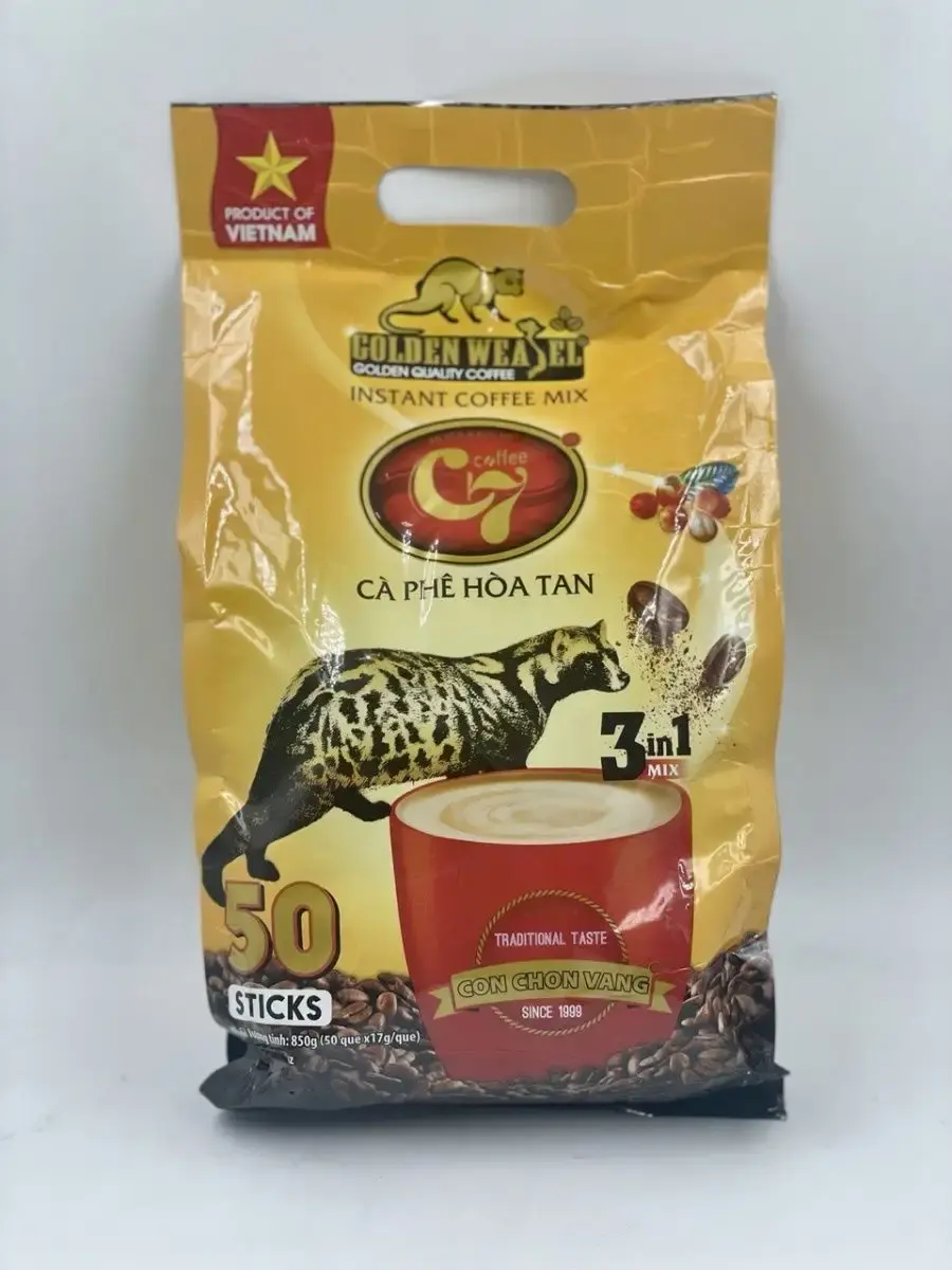 Растворимый вьетнамский кофе 3in1 Golden Weasel C7 50 sticks HUCAFOOD – практичная упаковка полюбившегося 100% натуральный кофе с добавлением сахара и молока. Это один из самых популярных продуктов среди почитателей быстрого и натурального кофе. Растворимый кофе из Вьетнама получен из кофейных зерен, выращенных на знаменитых базальтовых почвах легендарной провинции Дак Лак близ Буон Ми Туот. Голден Визел Инстант 3 в 1 сочетает в себе секреты натурального кофе и самые современные технологии производства. Продукция линейки C7 имеет отличительный знак золотой ласки, знаменитой своей причастностью к производству кофе Копи Лювак. Продукция Hucafood С7 обладает высоким качеством и выразительными натуральными вкусовыми характеристиками традиционного вьетнамского кофе. Способ приготовления растворимого кофе 3in1 Golden Weasel C7 - Huca Food, рекомендованный производителем: для получения горячего напитка: В 70 мл горячей воды добавить 1 саше растворимого кофе 3 в 1 и тщательно перемешать. Вспенив напиток, Вы получите готовый капучино с плотной аппетитной пенкой. Для приготовления освежающего холодного напитка: В 60 мл горячей воды растворить 2 саше кофе 3 в 1, добавить лед. Бодрящий и вкусный холодный кофе готов!Hucafood – golden weasel instant coffe 3 в 1 – ароматный напиток с мягким сливочным вкусом натурального кофе, сладостью и с шоколадными нотками. Во Вьетнаме принято пить очень насыщенные напитки. При желании Вы можете смягчить вкус, добавив большее количество воды.