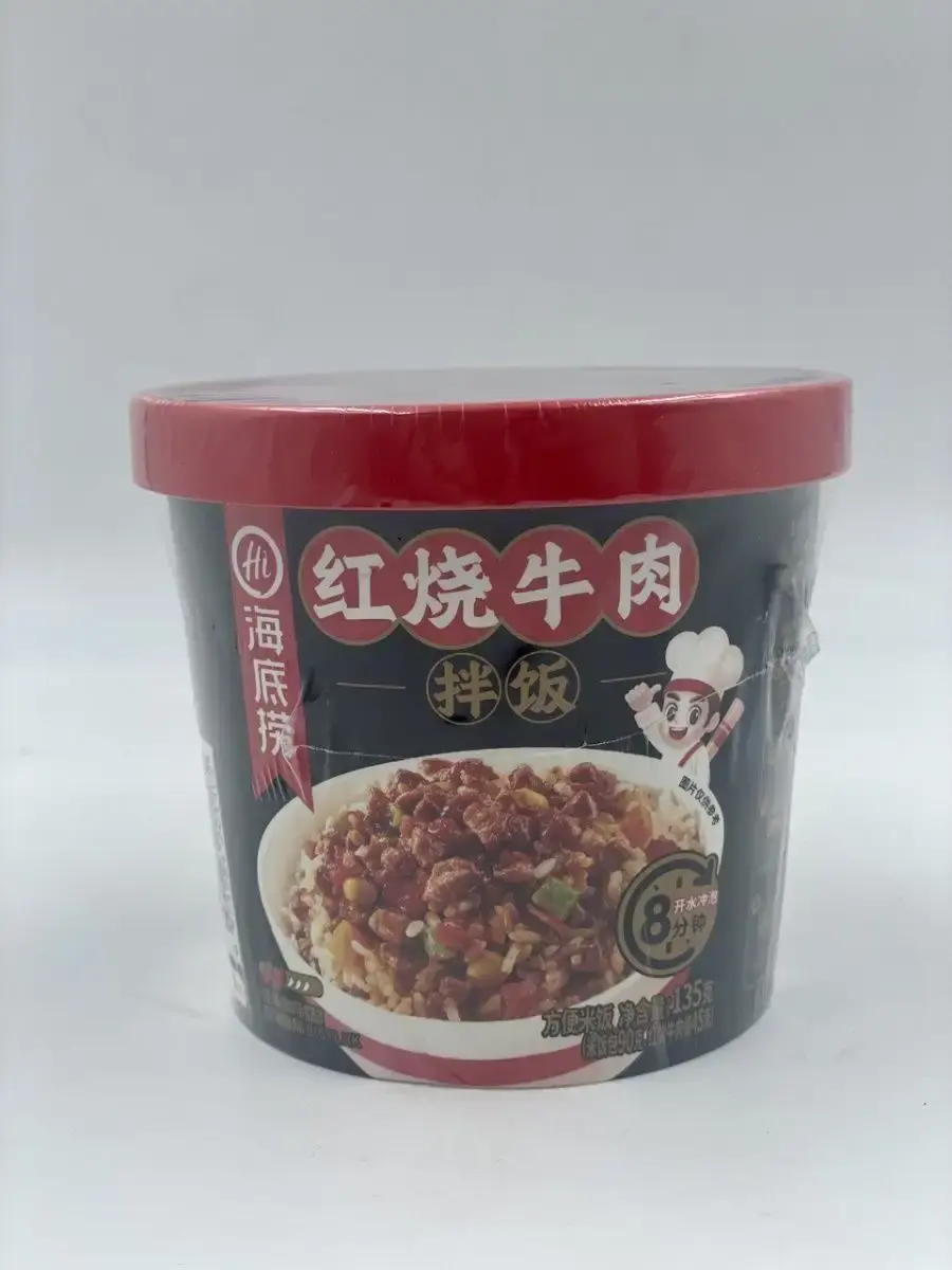 Haidilao Рис быстрого приготовления - популярное азиатское блюдо, традиционно считающееся одним из основных в корейской кухне, завоевавшее сердца людей не только в Корее, Китае, Сингапуре и других странах Азии, но и по всему миру. Состоит из отварного риса с добавками из овощей, , мяса или морепродуктов, приправленных соусами на основе чили или других видов перца. Ароматное и сытное блюдо, которое не оставит вас голодным.Способ приготовления:1.Откройте крышку стакана, распакуйте пакетики с рисом и овощами, засыпьте их в стакан.2.Залейте в стакан кипяток, согласно отметке внутри/снаружи стакана.3.Закройте крышку и дайте настояться в течение 8 минут*.4.Откройте крышку и положите содержимое пакетика с начинкой в стакан.5.Хорошо перемешайте и наслаждайтесь горячим обедом.