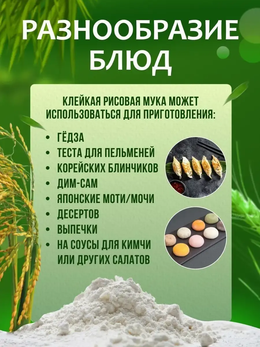 Наша рисовая мука без глютена производится из высококачественного риса, который обладает высоким содержанием крахмала. Это обеспечивает идеальную текстуру и вкус наших продуктов. Наша мука идеально подходит для приготовления моти - известных японских сладостей, которые являются популярным десертом в Японии.