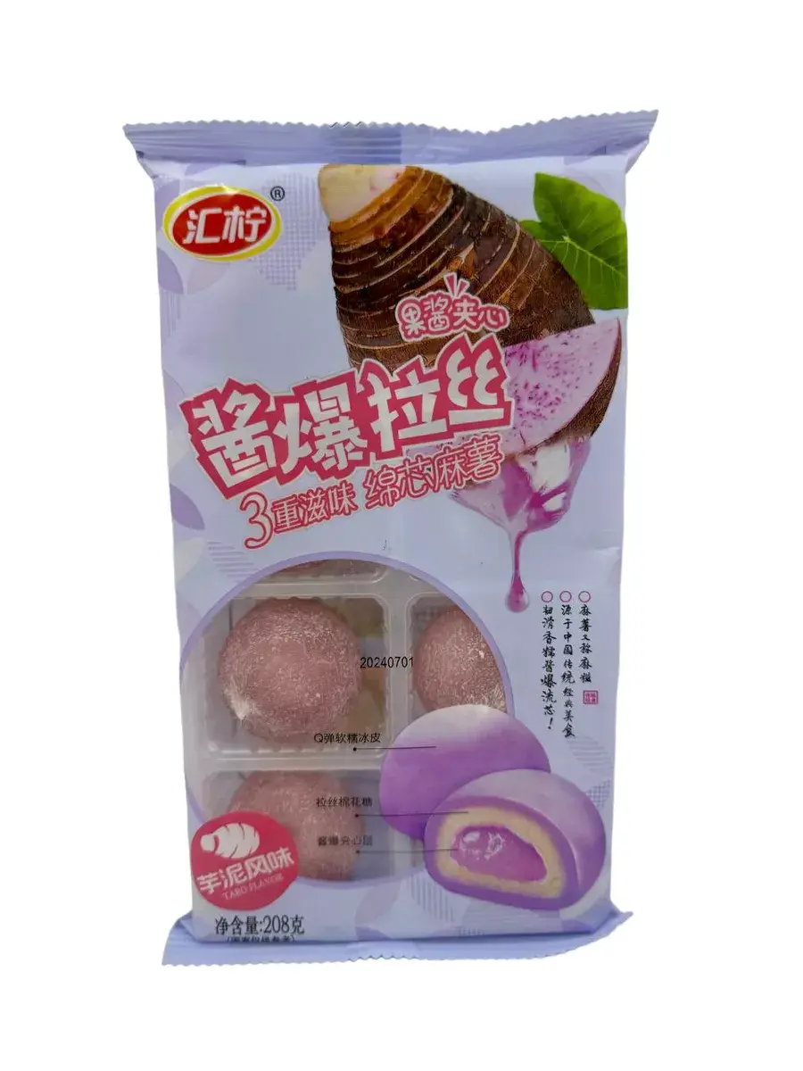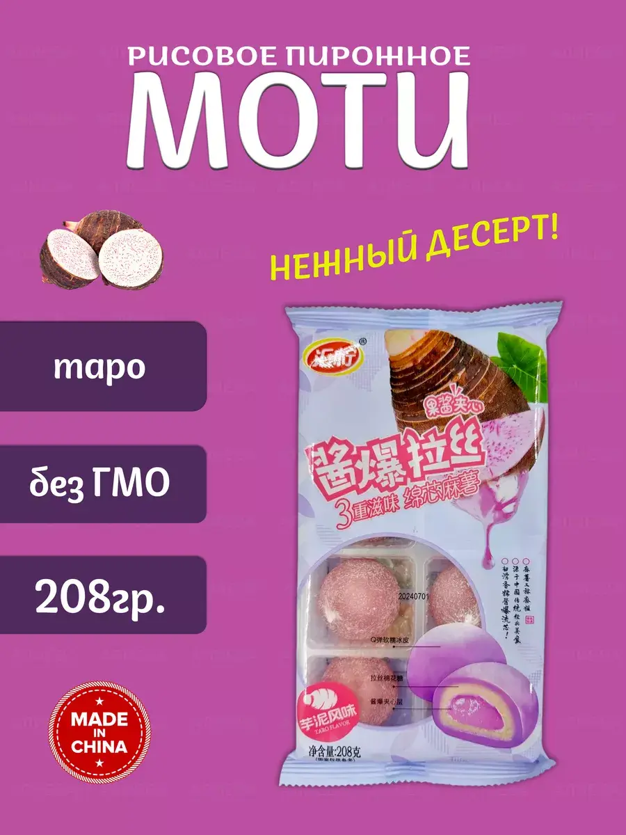 Традиционный десерт азиатских стран - рисовое пирожное моти с классической начинкой из сладкого фиолетового картофеля таро. Таро - это ближайший родственник сладкого картофеля, на вкус он как сладкая ваниль, но очень похоже на картофель. В Азии его используют для приготовления десертов. Рисовые пирожные упакованы в яркую красочную коробку, которую смело можно подарить родным и близким. Десерт по текстуре мягкий и нежный. Продукт полностью готов к употреблению, отлично подходят для чаепития.