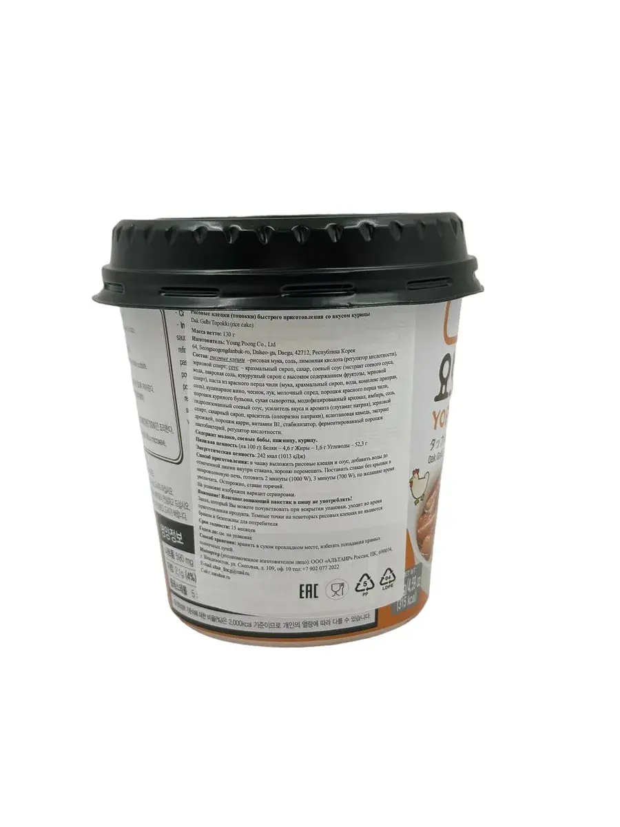 Рисовые палочки Токпокки со вкусом курицы Дак Гальби (стакан) Dak Galbi Yopokki – это любимые рисовые клецки Токпокки из рисовой муки в остро-сладком соусе Дак Гальби, в котором готовят популярное и знаменитое одноименное корейское блюдо из курицы, разновидность блюда на гриле – Кальби. Соус отличается богатой вкусовой гаммой и высоким уровнем остроты, радующим поклонников корейской кухни. Упругие жевательные рисовые клецки в горячем вкусном соусе станут отличным вариантом обеда на рабочем месте или в условиях нехватки времени. Нужно только высыпать сухие рисовые палочки в стакан-упаковку, добавить соус (находится вместе с клецками в стакане) и налить воды до отметки на внутренней стороне стакана. Перемешать содержимое стакана и поставить в микроволновку на 2-3 минуты. И вкусный горячий корейский обед готов.