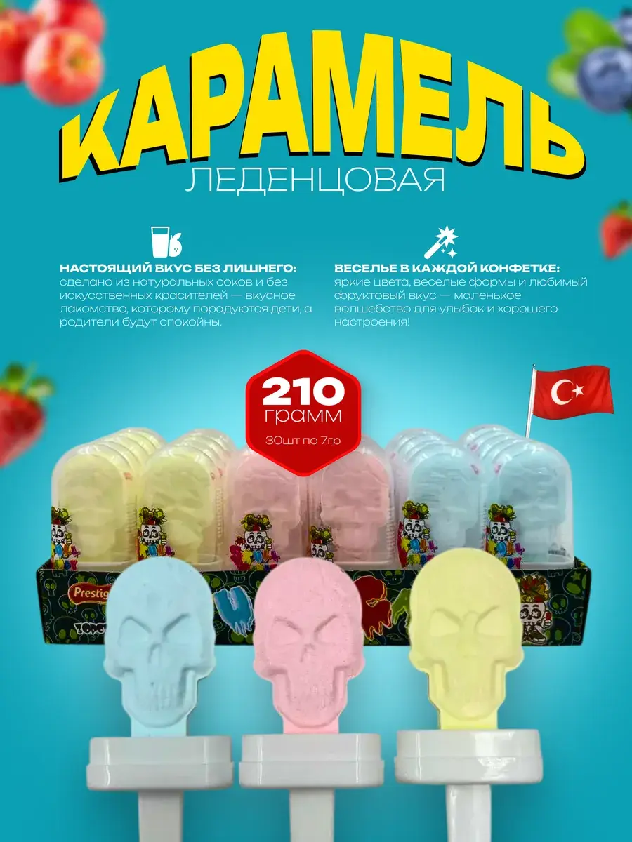 Турецкий бренд Prestige представляет необычные сахарные конфеты в форме стилизованного черепа, которые удивят и порадуют любителей оригинальных сладостей. В каждой упаковке вы найдете 30 сочных конфет весом по 7 граммов каждая, упакованных в индивидуальные обертки для сохранения свежести и аромата. Насладитесь взрывным сочетанием трех популярных вкусов: сладкой клубники, освежающего зеленого яблока и насыщенной лесной черники.