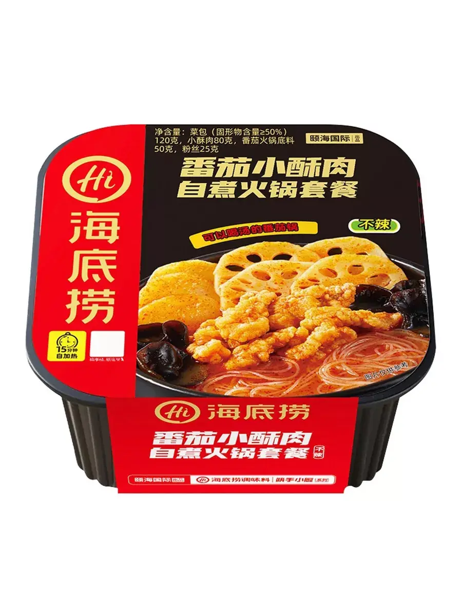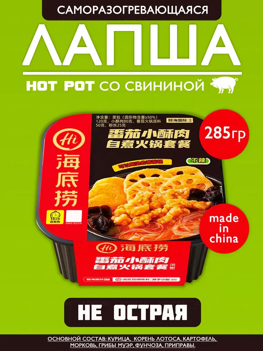 Саморазогревающаяся лапша Haidilao Hi Hot Pot со вкусом томата и свинины (Hi Mega Big), которая не требует кипятка. Это вариант быстрого приготовления с саморазогревом. Внутри упаковки вы найдете белый пакет, с помощью которого и происходит разогрев. Просто нужно добавить воды - и она сама закипит - очень крутой процесс приготовления. Одной порции хватит на двух человек, так как вес сухого продукта составляет более 400 грамм.Процесс приготовления таков: на дно большого контейнера кладется самонагревающийся пакет, заливается небольшим количеством воды, сверху ставим основной контейнер с лапшой, в который предварительно высыпается лапша и все прочие ингредиенты из пакетиков. Накрываем крышкой и ждём 15 минут. Готово! Обязательно поделитесь с друзьями - порция огромная! Основной состав: Курица, , корень лотоса, картофель, морковь, грибы муэр, фунчоза, приправы. Этот продукт имеет острый вкус, пожалуйста, добавьте острую приправу на свой вкус.
