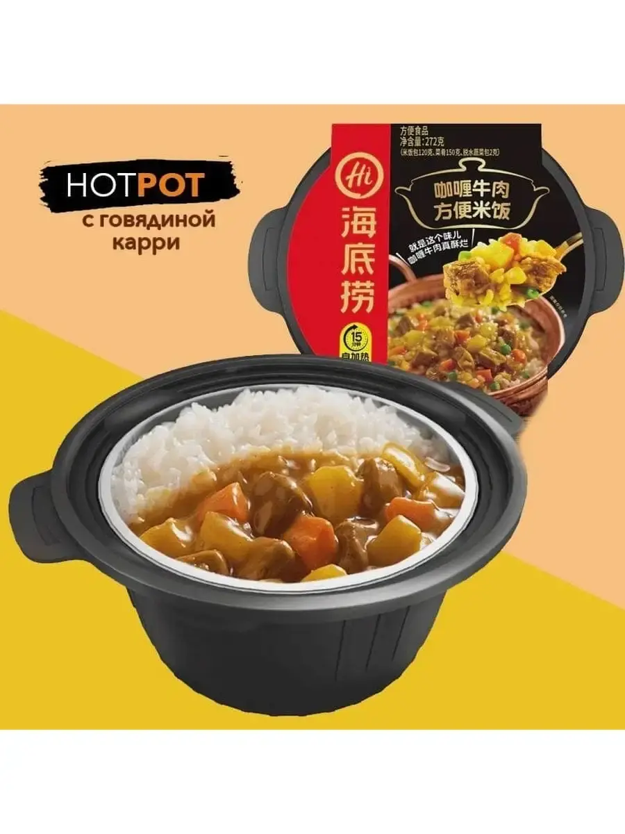 Саморазогревающийся рис Hi Hot pot, это вариант быстрого приготовления с саморазогревом. Внутри упаковки вы найдете белый пакет, с помощью которого и происходит разогрев. Просто нужно добавить воды и она сама закипит - очень крутой процесс приготовления, полноценный обед который удобно брать с собой. В данной карточке вы можете приобрести саморазогревающийся рис Hi Hot Pot Haidilao с тремя разными вкусами: 1. с колбаской и беконом, 2. Говядина Карри, 3. Тушеная говядина с овощами. Способ приготовления: 1. Открыть упаковку, достать внутренний контейнер и все ингредиенты. 2. Сложить во внутренний контейнер рис, соус и добавки. 3. Положить на дно контейнера саморазогревающийся элемент, добавить воды в оба контейнеры (во внешний до указанного уровня), вставить внутренний контейнер во внешний. 4. Через 1-2 минуты вы услышите звуки кипения и увидите струйку горячего пара из крышки, через 5-10 минут рис будет готов. Перемешайте и наслаждайтесь!