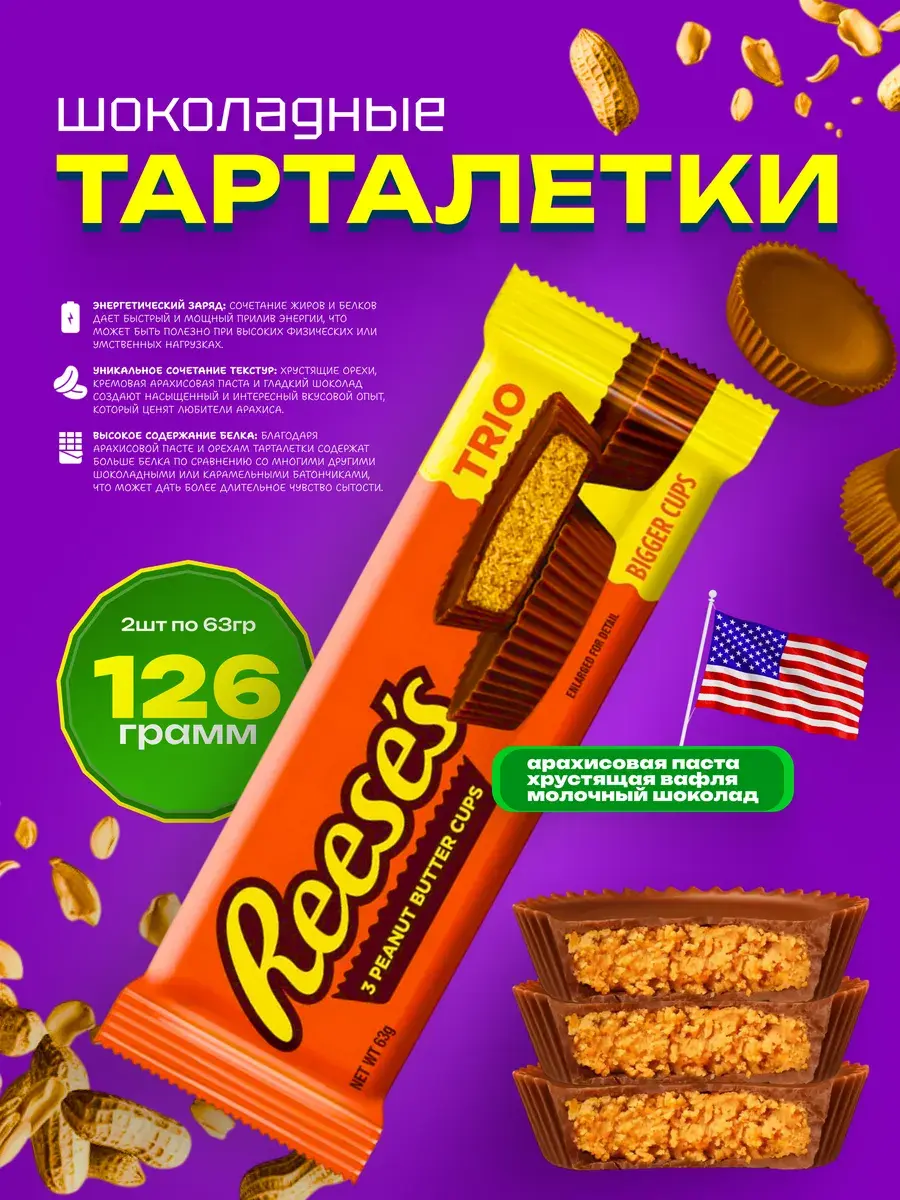 Reese’s Peanut Butter Big Cups — это большая порция шоколадного удовольствия, которая не оставит равнодушным ни одного сладкоежку. В состав продукта входят натуральные ингредиенты, такие как арахисовое масло, высококачественный молочный шоколад и хрустящая вафля.