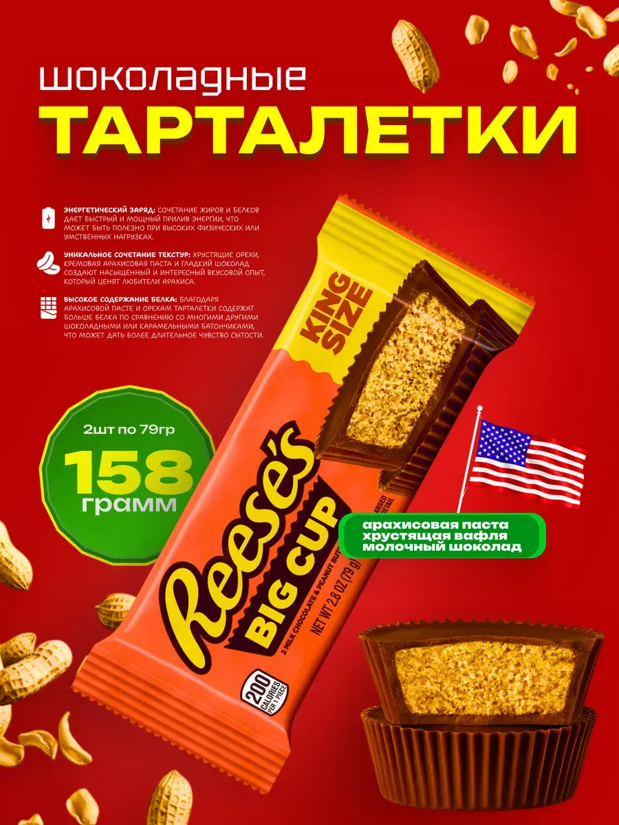 Reese’s Peanut Butter Big Cups — это большая порция шоколадного удовольствия, которая не оставит равнодушным ни одного сладкоежку. В состав продукта входят натуральные ингредиенты, такие как арахисовое масло, высококачественный молочный шоколад и хрустящая вафля.