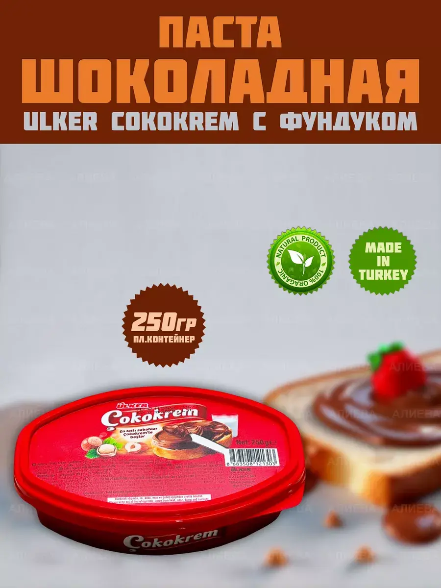 Состав шоколадной пасты включает в себя только лучшие ингредиенты. Шоколадная паста Ulker Cokokrem имеет шелковистую кремовую текстуру и насыщенный вкус какао и лесного ореха.