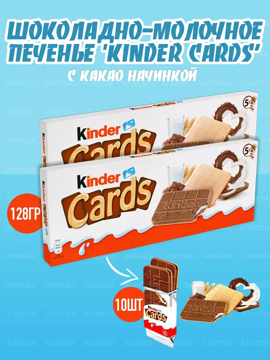 Kinder Cards - очень тонкое печенье, но при первом же укусе вы обнаруживаете неожиданную сливочную начинку из молока и какао, что придает удивительный вкус. Какао-вафля хрустящая и не тает, поэтому ее всегда можно взять с собой! Популярная сладость немецкого производителя КиндерСостав:обезжиренное молоко (28%), сахар, пальмовое масло, пшеничная мука (15%), обезжиренное какао (4%), подсолнечное масло, эмульгатор лецитин (соя), соль, разрыхлитель, гидрокарбонат натрия, ванилин.