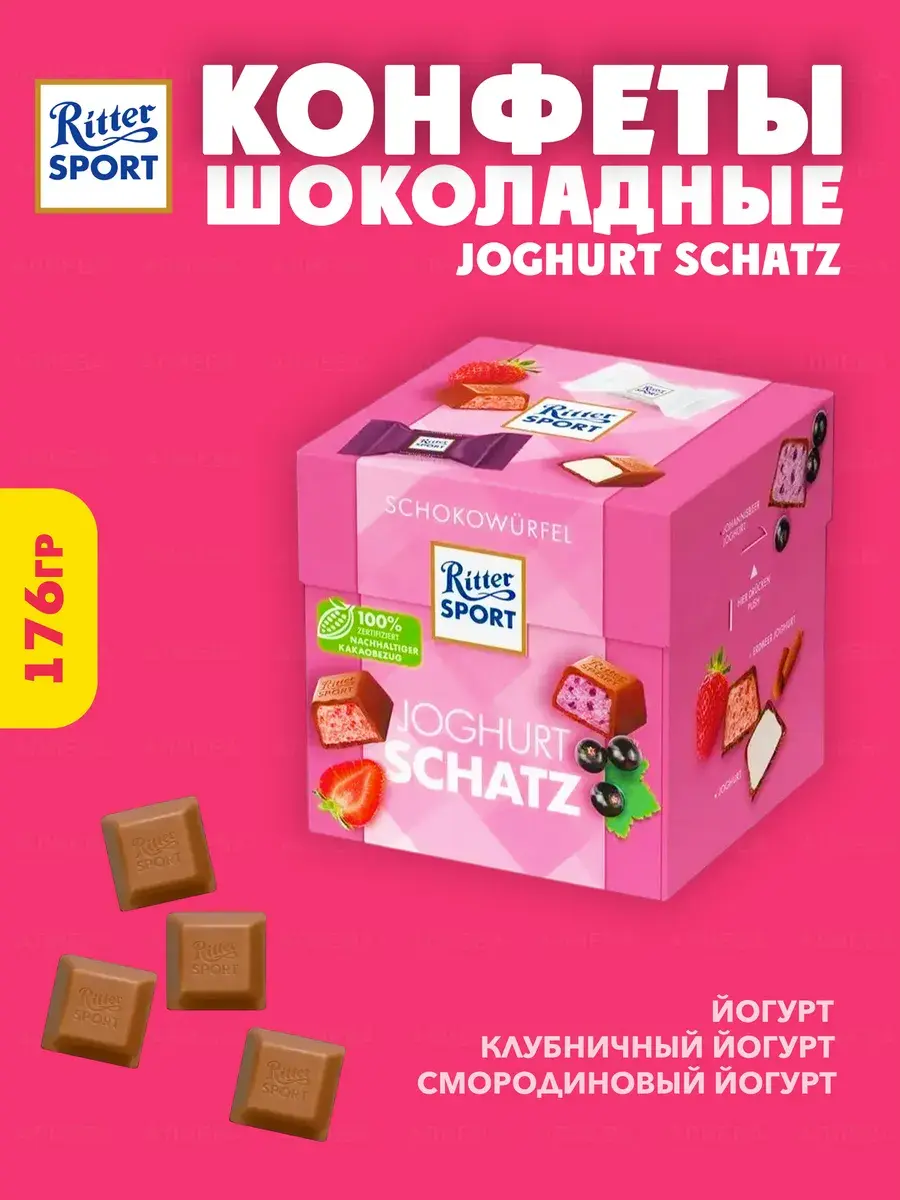 Ritter Sport Choco Yogurt – эксклюзивные немецкие шоколадные конфеты, с необычными йогуртовыми начинками. Молочный Риттер Спорт шоколад, который использовался для производства, способствует быстрому восстановлению энергии, насыщению углеводами и глюкозой, а сливочный наполнитель, восполняет запасы кальция, вымытого из организма вместе с потом спортсмена. Полезный мини шоколад Ritter Sport, является уникальным лакомством, позволяющим не только насладится продуктом, но и получить значительную пользу. Одна коробочка содержит 3 вкуса: нежная йогуртовая начинка, облитая молочным шоколадом Риттер, с явными включениями хрустящих рисовых шариков; ароматное клубнично-ванильное наполнение, с восхитительными красными кукурузными криспами, молочный шоколад Ritter Sport; густой черничный йогурт, с хрустящими темно-синими рисовыми чипсами, в лучшем немецком шоколаде.