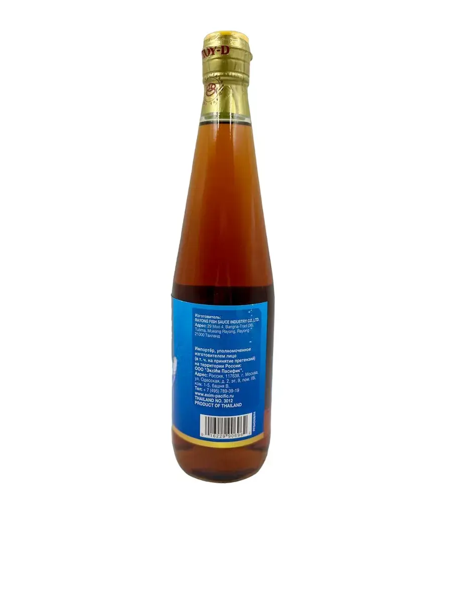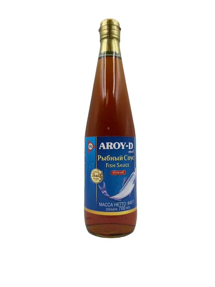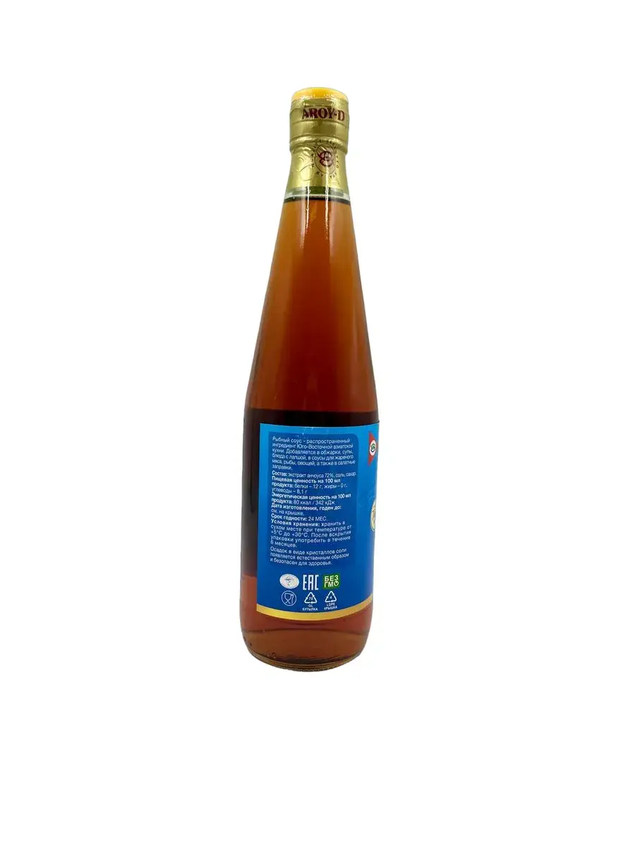 Соус рыбный Aroy-D - это самая важная в национальной тайской кухне приправа. Применяется для ароматизации готовых блюд и вместо соли, а также для улучшений вкуса. Его добавляют в жаренные блюда, супы карри, закуски, салаты, лапшу. На его основе готовят разные заправки, дип-соусы, добавляя в него различные специи – базилик, сок лайма, чеснок, кинзу и пр. Наилучшим образом подходит для блюд из морепродуктов. Обладает отменным, ярко выраженным запахом, который ослабевает по мере термообработки. Соус соленый, поэтому не следует сильно солить блюда, приготовленные с ним. Рыбный соус как правило готовят из морской рыбы, но иногда применяют и речную. Для его приготовления используют маленькую рыбу от 5 до 12 см. Только что пойманную рыбу подсушивают, после чего кладут в бетонные или глиняные емкости, посыпав дно морской солью, и перемежают между собой слои соли и рыбы. Потом все это накрывают бамбуковым ковриком. На коврик устанавливается груз, что бы рыба выделяла сок. Эти емкости стоят на солнце от 9 месяцев до года. Когда приходит время, жидкость сливают. Затем ее фильтруют, переливают в стерильные емкости, оставляют ещё на пару недель на солнце. Таким образом получают 100% рыбный соус.