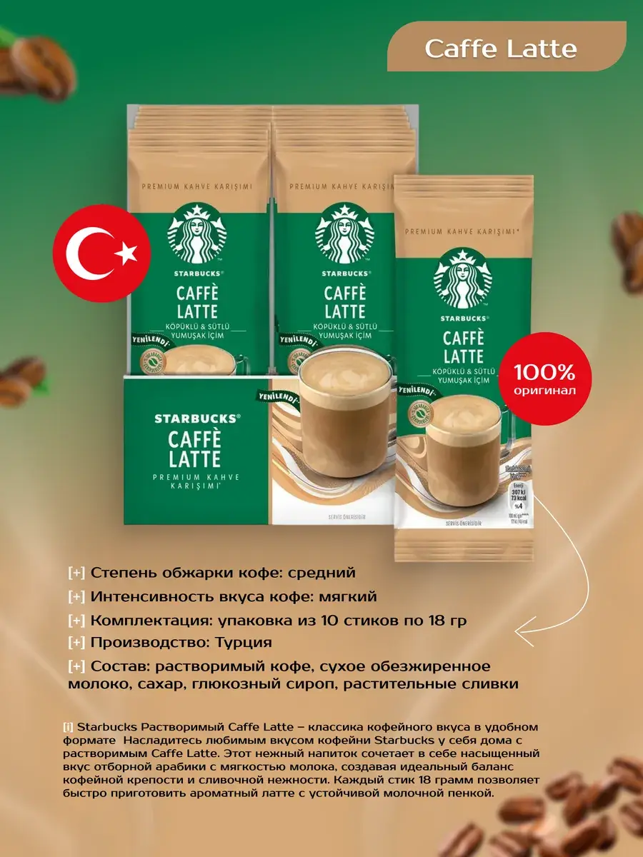 Starbucks Растворимый Caffe Latte сохраняет все характеристики классического латте: бархатистую текстуру, сбалансированный вкус и приятное послевкусие. Это выбор тех, кто предпочитает проверенное качество и любит начинать день с чашки превосходного кофе.