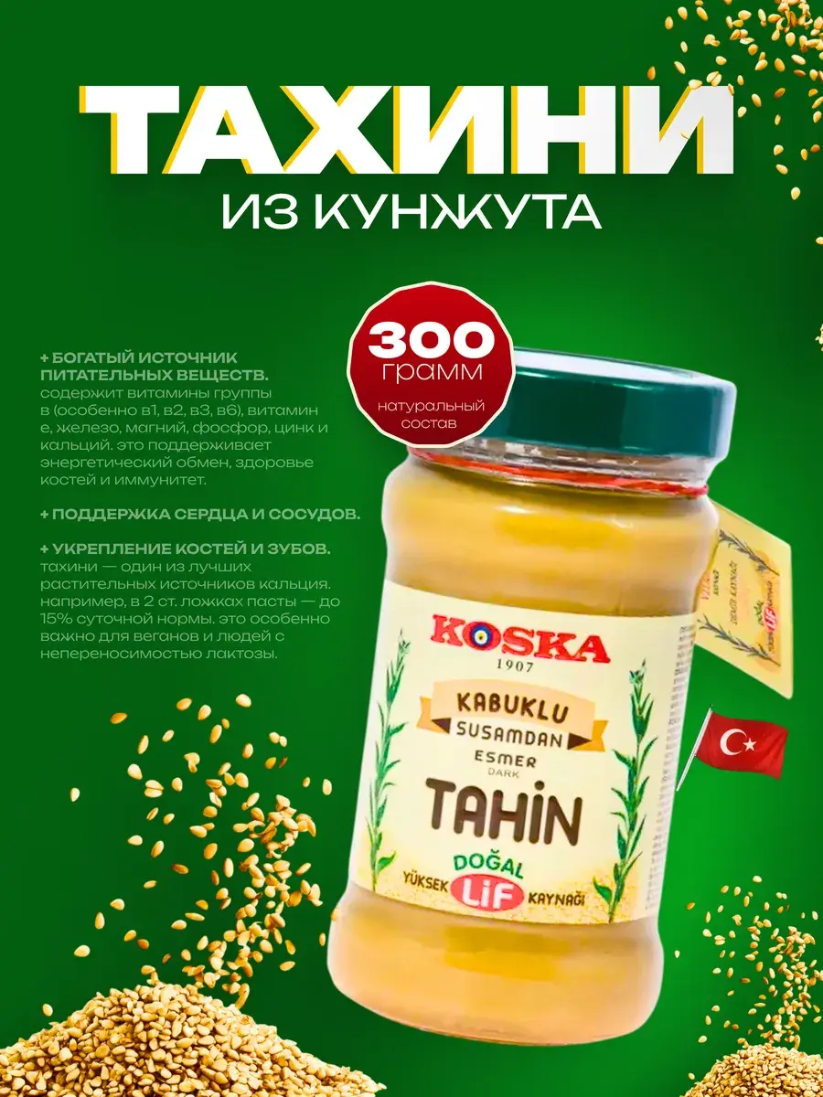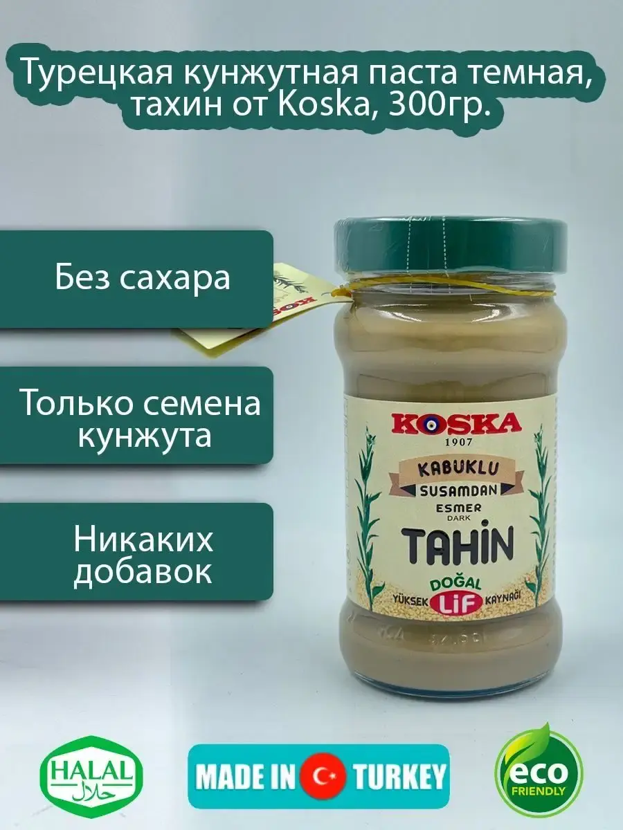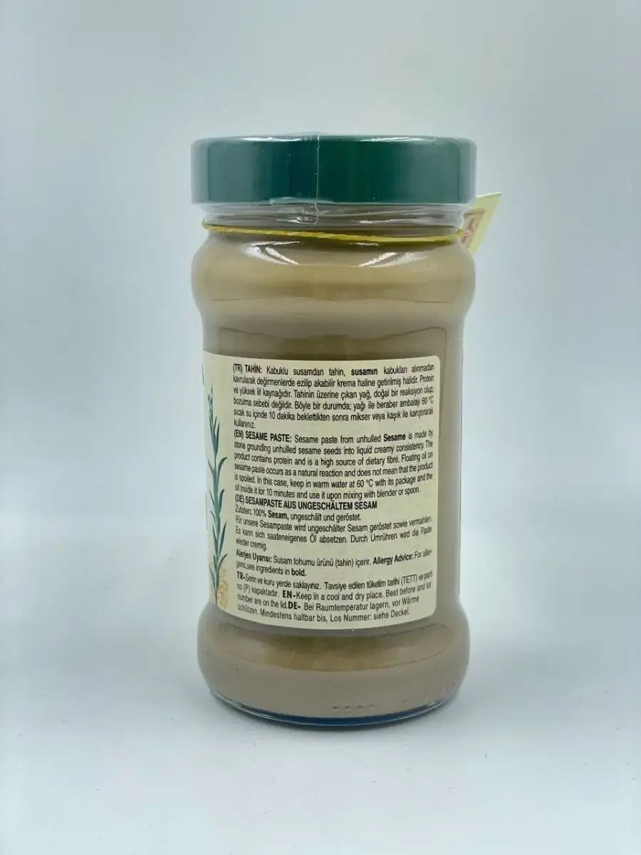 Тахини (или тахина) - это популярная паста на Востоке, полученная из перетертого кунжутного семени. Основа всех известных арабских яств, добавляется в первые и вторые блюда, десерты, а также обязательная составляющая хумуса. Этот продукт завоевал сердца многих гурманов во всем мире, благодаря своим питательным свойствам и уникальному вкусу. Паста тахина готовится только из натуральных семян кунжута с добавлением лимонного сока, без использования ароматизаторов и красителей. Это настоящий источник полезных жирных кислот. Кунжутную пасту тахину часто добавляют в соусы и заправки, она отлично сочетается с рыбой и бобовыми, овощами и мясом. В тахину можно добавить чеснок, оливковое масло, карри и другие любимые Вами кулинарные изюминки. Это поистине настоящая находка для тех, кто придерживается здорового питания.