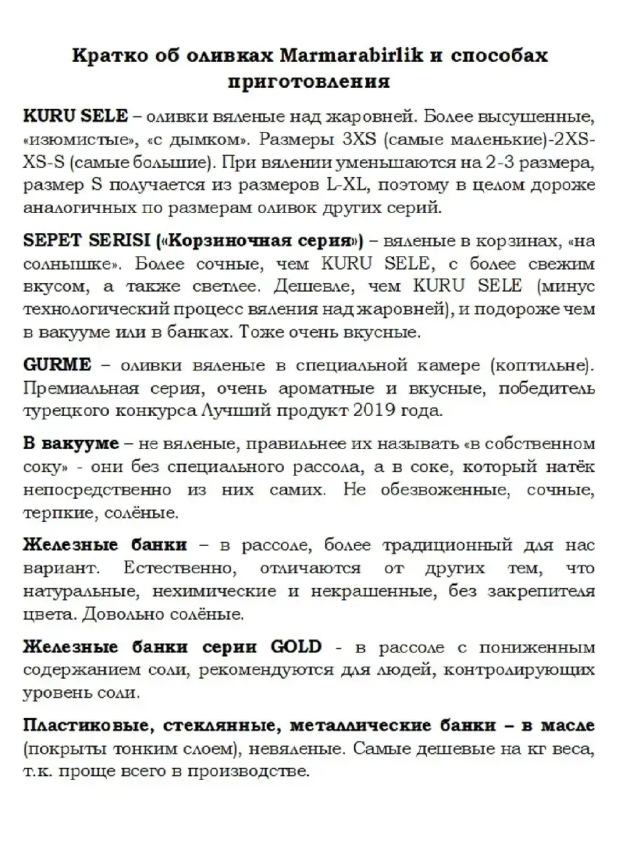 Компания MARMARABIRLIK основана в 1954 году. Она входит в Топ-5 мировых производителей столовых оливок и является самым крупным производителем столовых оливок и оливкового масла в Турции. При производстве оливок используются только натуральные ингредиенты: кислоты (молочная, лимонная, аскорбиновая) и соли (хлорид кальция, сорбат калия). Все добавки разрешены к использованию во всех странах, не имеют суточных норм потребления.Оливки, которые выпускает турецкая компания MARMARABIRLIK, обладают восхитительными вкусовыми качествами и массой полезных свойств. В отличие от большинства продукции других торговых марок, эти оливки не подвергаются химической обработке, созревают непосредственно на ветках и вялятся естественным путем. Их выдерживают в морской соли с целью устранения характерной горечи. Правда, при этом пикантная горчинка все равно остается, ее дает самое полезное в оливках вещество под названием олеуропеин.