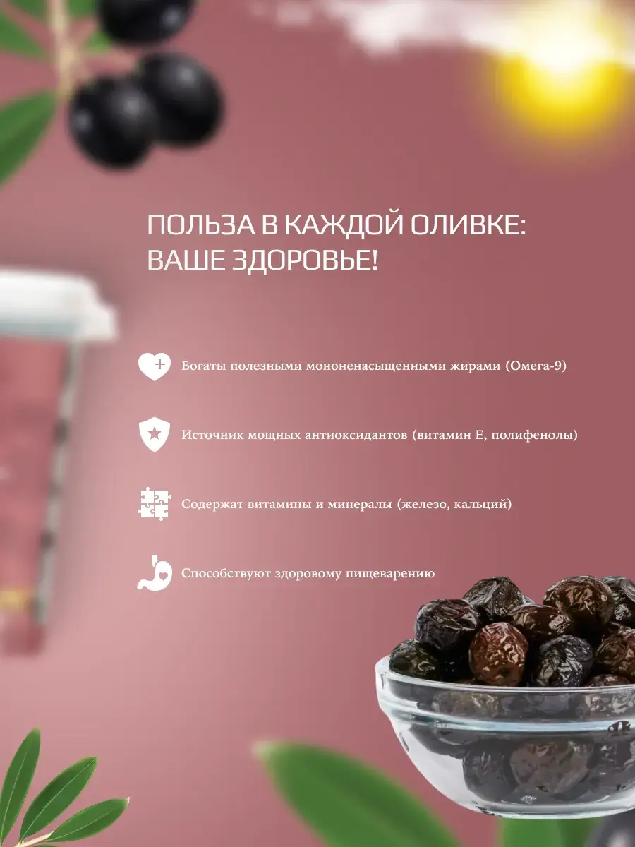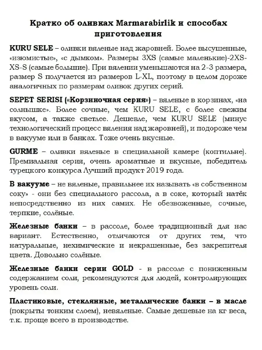 Эти оливки не похожи на те, что продают в банках. жидкости в них практически нет, только небольшое количество - буквально пару грамм, ароматного, вкуснейшего масла цвета соевого соуса. И самое главное это созревшие естественным путем оливки, коричневого цвета, а не крашеные, в отличие от знакомой всем нам консервированной продукции. В этом можно убедиться по некоторой неоднородности цвета кожицы и по косточке, которая не крашеная, а натурального цвета.Вкус у вяленых оливок более яркий и насыщенный чем у тех которые Вы пробовали до этого, консистенция мягкая, чуть подвяленная, но не сухая и по этому косточка сама легко отделяется. Терпкие, чуть горьковатые плоды, казалось, впитали в себя брызги соленого морского ветра.Вяленые оливки Marmarberlik ни с чем не сравнимые , вызывающие привыкание и зависимость! Бессмысленно описывать вкус оливок, их нужно покупать и пробовать.